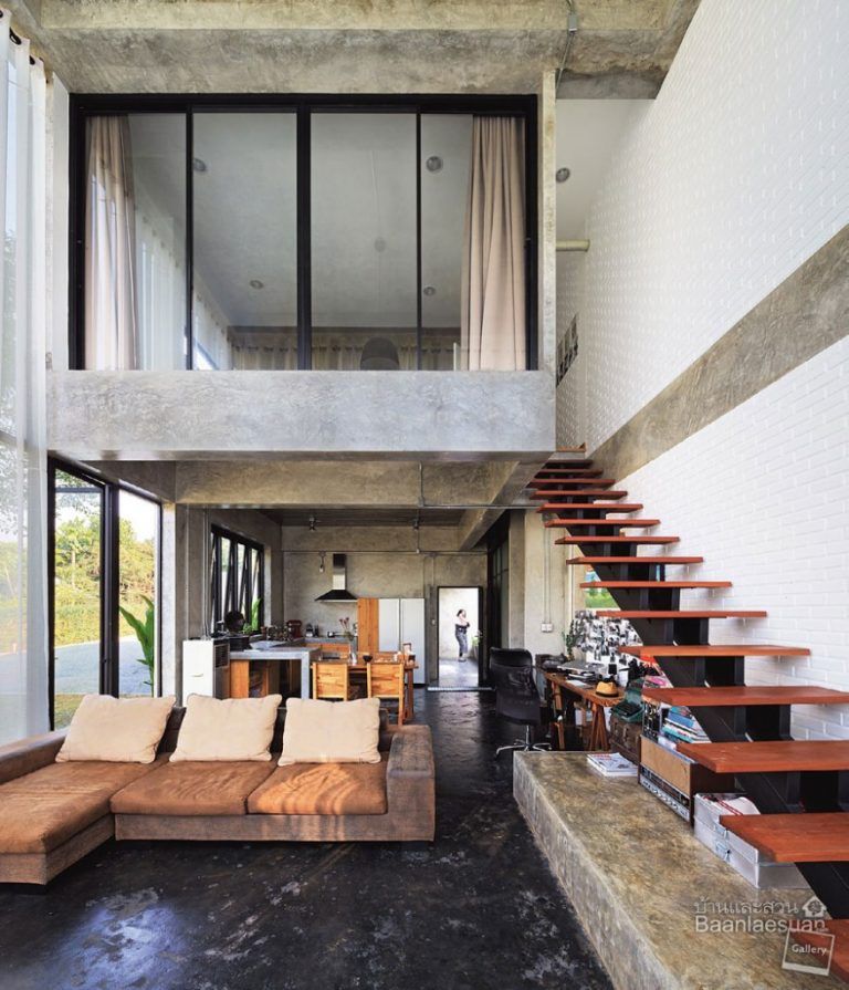 Jika pada poin sebelumnya lebih menekankan pada nuansa minimalis, ide yang satu ini memberikan Anda perspektif baru melalui tekstur ekspos serta estetika yang lebih maskulin. Dengan menghadirkan elemen-elemen tersebut, desain semi industrial bisa menjadi pilihan Anda dalam model rumah 1 ½ lantai. Kombinasi beton ekspos, rangka besi pada tangga, railing logam, dan lampu gantung industri dapat memberikan nuansa urban yang kuat. Lantai setengah lantai biasanya bisa dibuat sebagai ruang kerja terbuka atau area baca yang menghadap ruang utama. Dengan desain ini, bagian atas rumah tidak terasa seperti sebuah ekspansi yang kaku, melainkan sebuah kesatuan estetika yang terkonsep.