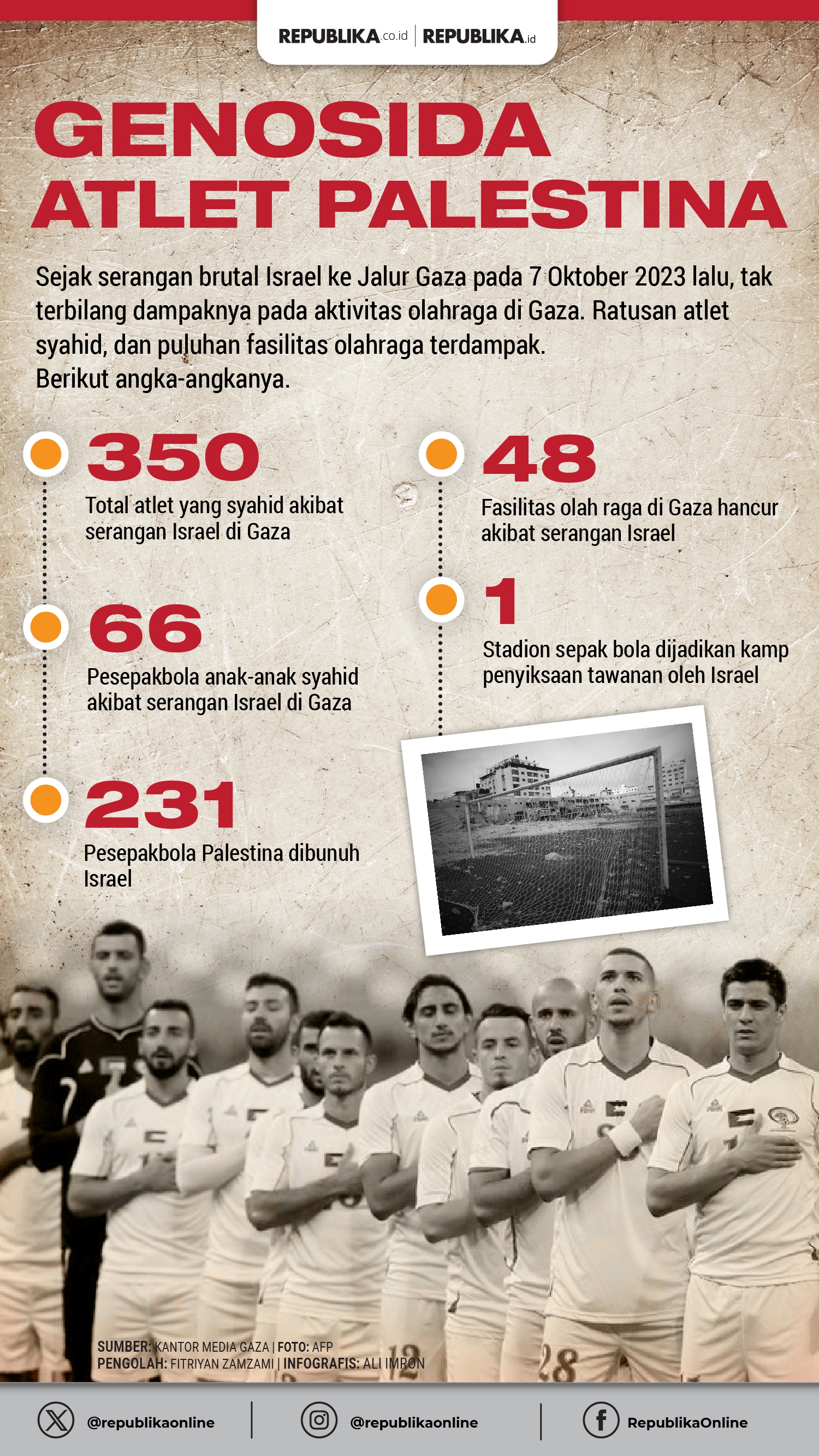 Serangan Israel yang sedang berlangsung – yang kini memasuki tahun kedua genosida di Gaza – telah menghancurkan olahraga Palestina. Atlet, pelatih dan wasit telah dibunuh, dan seluruh fasilitas olahraga telah dibom, dibakar atau dijadikan kuburan massal. Sekitar 90 persen infrastruktur olahraga di Gaza dilaporkan hancur.