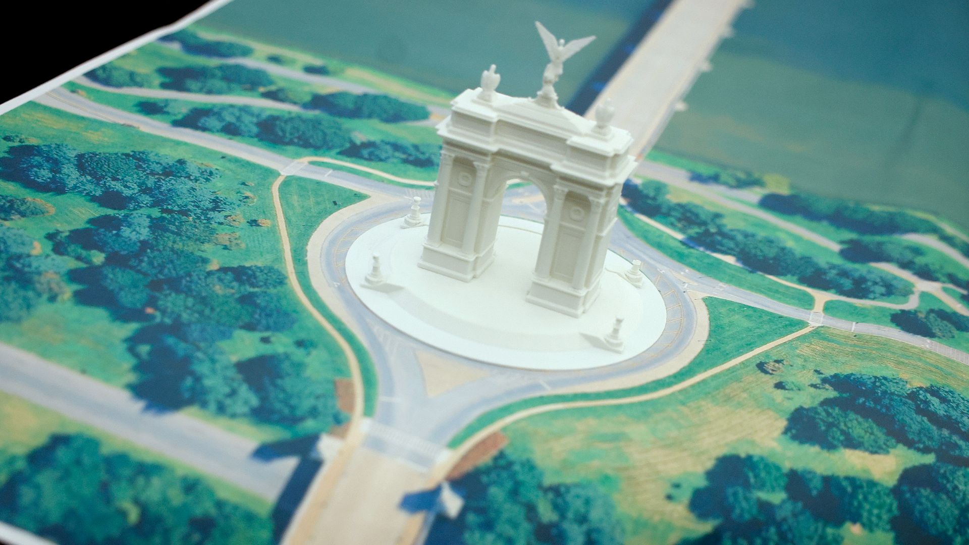 Das Modell wurde von Jason Montgomery, einem Architekten und Stadtplaner, entworfen. Laut der New York Times sagte er, der Plan, einen Triumphbogen zum 250. Jahrestag Amerikas zu bauen, erscheine „vernünftig“, mahnte aber, dass er in diesem „sehr polarisierten Moment“ alle Amerikaner repräsentieren sollte