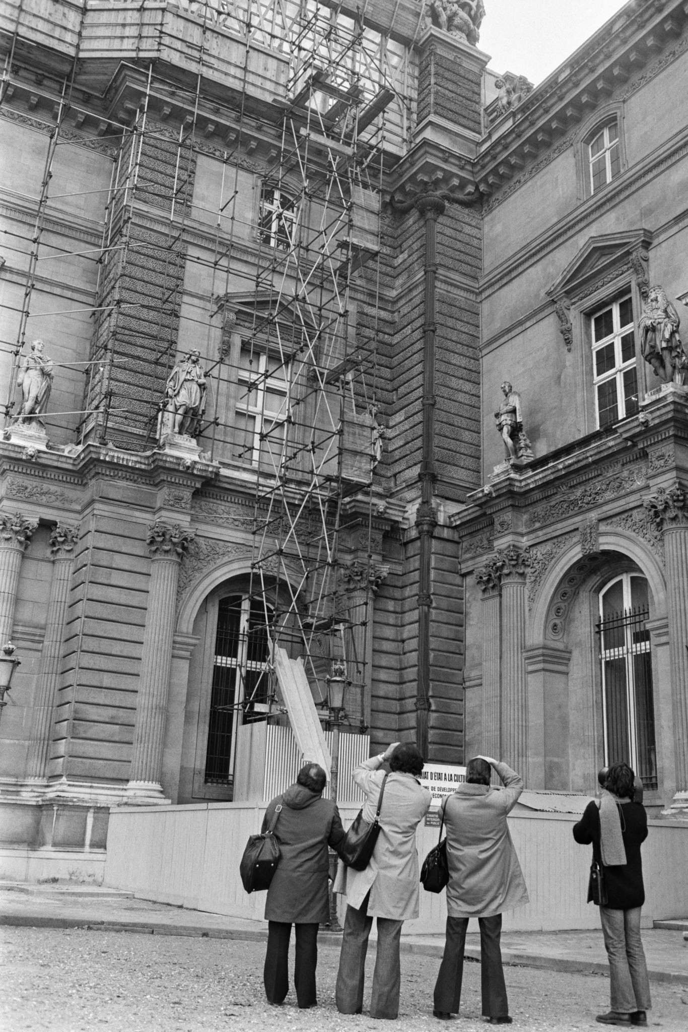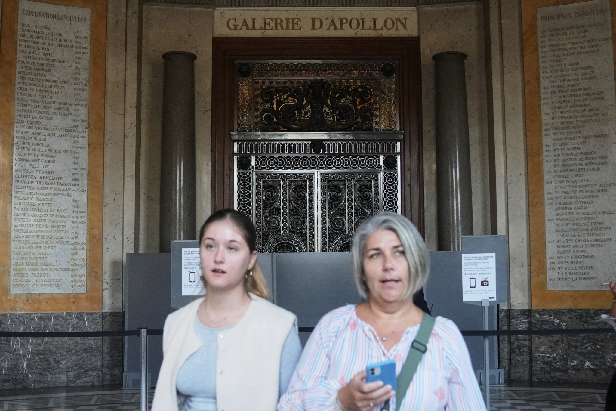 Der Zugang zur Apollo-Galerie ist einigermassen bescheiden zugestellt, mit schwarzen Absperrbändern und einer grauen Behelfswand, Informationsblätter weisen auf ein Fotoverbot hin. Mitarbeitende des Museums fordern die Besucherinnen und Besucher auf, nicht stehen zu bleiben und weiterzugehen.
