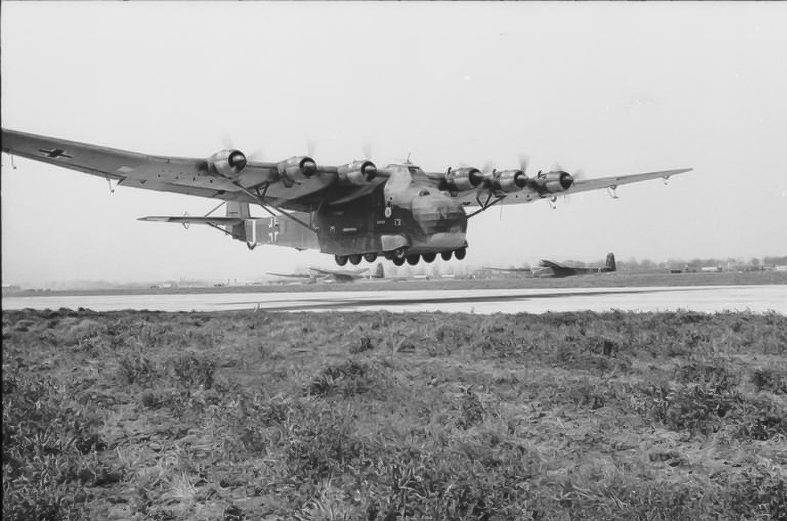Während diese verzweifelten Versuche stattfanden, arbeitete Messerschmitt gleichzeitig an einer motorisierten Version – der Me 323 (Bild). Diese funktionierte zwar, war aber so langsam und schwerfällig, dass sie sich im umkämpften Luftraum als äußerst verwundbar erwies. Bei einer bemerkenswerten Gelegenheit im April 1943 geriet ein Flug von 27 Me 323 in der Nähe von Sizilien in einen Hinterhalt alliierter Spitfires und P-40, wobei 16 Me 323 verloren gingen.