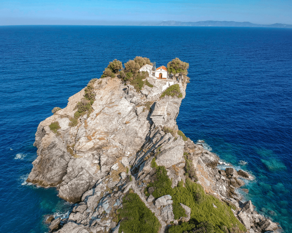 Ein Highlight ist die Kirche Àgios Ioánnis sto Kastrí, die spektakulär auf einem Felsen thront. Über 100 Stufen führen hinauf – oben erwartet dich ein unvergesslicher Blick über das Meer. Auch die Strände Kastani Beach und Glysteri Beach dienten als Drehorte und sind heute beliebte Ausflugsziele. Trotz des internationalen Ruhms blieb Skopelos verhältnismäßig ruhig: große Hotelanlage sucht man hier vergeblich.