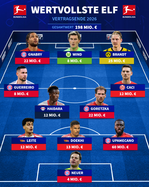 Beim FC Bayern droht der ablösefreie Abgang von Dayot Upamecano und fünf weiteren Profis. Beim BVB sind es ebenfalls sechs plus Leihspieler Aarón Anselmino (Chelsea) – darunter Julian Brandt und Top-Verdiener Niklas Süle, während der Kaderwert des HSV im Sommer um 52 Prozent sinken könnte.