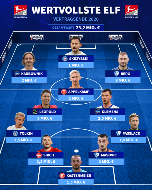 Traditionell haben Aufsteiger viele auslaufende Verträge oder Leihen – so auch der 1. FC Köln und der Hamburger SV. Bei den Rothosen enden fünf Arbeitspapiere, darunter die der Stammspieler Ransford Königsdörffer und Daniel Heuer Fernandes sowie fünf Leihen. Vor allem wegen Fábio Vieira (Arsenal) und Luka Vuskovic (Tottenham) droht den Hamburgern im Falle eines Abgangs dieser zehn Profis ein Verlust im Kaderwert von 55,4 Mio. Euro (zu allen auslaufenden HSV-Verträgen).