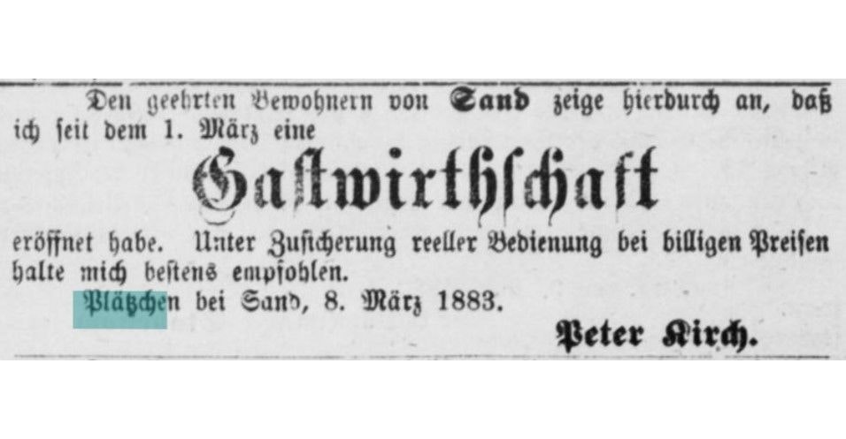 Ein Befund, der Werling in die Archive führte, um mehr über das Haus und seine Geschichte zu erfahren. Als Eigentümer und wohl auch Erbauer des Hauses ermittelte er Peter Kirch (1829-1896), Wirt und Ackerer zu Sand. 1874 ließ der Kleinlandwirt in Wesselsteinbach, südöstlich der Ortslage Plätzchen, Wohnhaus und Stallungen seiner verstorbenen Schwiegereltern versteigern.