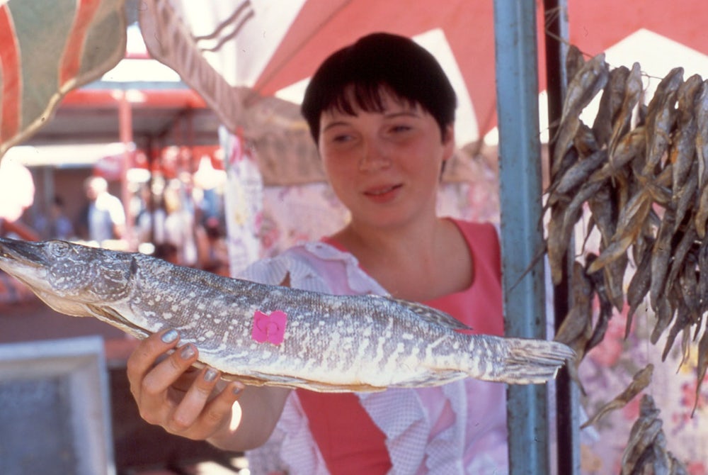 Eine wichtige Rolle im Film spielt der Hauptmarkt der ukrainischen Hafenstadt, die wir heute vor allem aus den Nachrichten über russische Angriffe kennen. Und dort wiederum stehen die Marktfrauen, die Fisch-, Fleisch- oder Plastiktütenverkäuferinnen im Zentrum. Diese sieht man in der Ausstellung auch auf Fotos, von denen Ottinger viele damals durch die Windschutzscheibe des VW-Busses gemacht hat. Was manche Unschärfe erklärt. Auch vom Container- oder Sieben-Kilometer-Markt in Odessa gibt es eindringliche Schwarzweiß-Bilder, die aber 2003 entstanden. Damals war die heute 83-Jährige noch einmal in der Stadt, um dort den Spielfilm „Zwölf Stühle“ zu drehen.