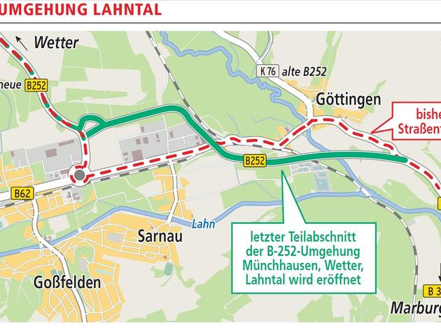 Das Bauprojekt war in drei Teile gestaffelt. Der mittlere Teil von Wetter nach Lahntal-Goßfelden ist seit Ende 2019 fertig. Die nördliche Umgehungsstrecke von Wetter bis zum Burgwalder Ortsteil Ernsthausen wurde vor fast genau zwei Jahren, am 19. Oktober 2023, freigegeben. Damit war der größte Teil der Umgehung, die neun Kilometer lange Strecke von Ernsthausen bis Goßfelden, fertig. Sehr zur Freude in den Kommunen Münchhausen und Wetter.
