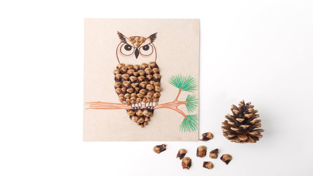 Eine Eule aus Tannenzapfen? Ja. Aus Zapfenschuppen wird im Nu ein „Federkleid“: Auf eine Eulenvorlage klebst du die trockenen Schuppen dicht an dicht – unten groß, oben kleiner, sodass ein lebendiger Verlauf entsteht. Kopf und Augen bleiben frei und werden gezeichnet oder mit Wackelaugen betont.