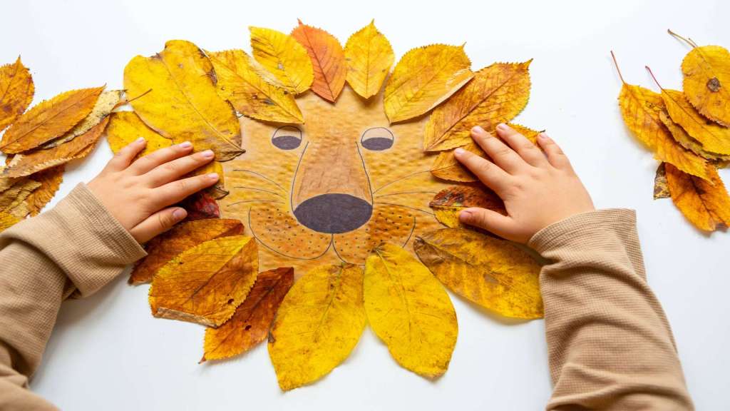 Dieser Klassiker holt den Wald direkt auf den Basteltisch: ein Löwe aus Blättern. Ein gezeichnetes Löwengesicht wird mit einer Mähne aus echtem Herbstlaub zum Hingucker. Unterschiedliche Gelb-, Orange- und Brauntöne bringen Tiefe, größere Blätter außen und kleinere innen wirken wie echtes Fell.