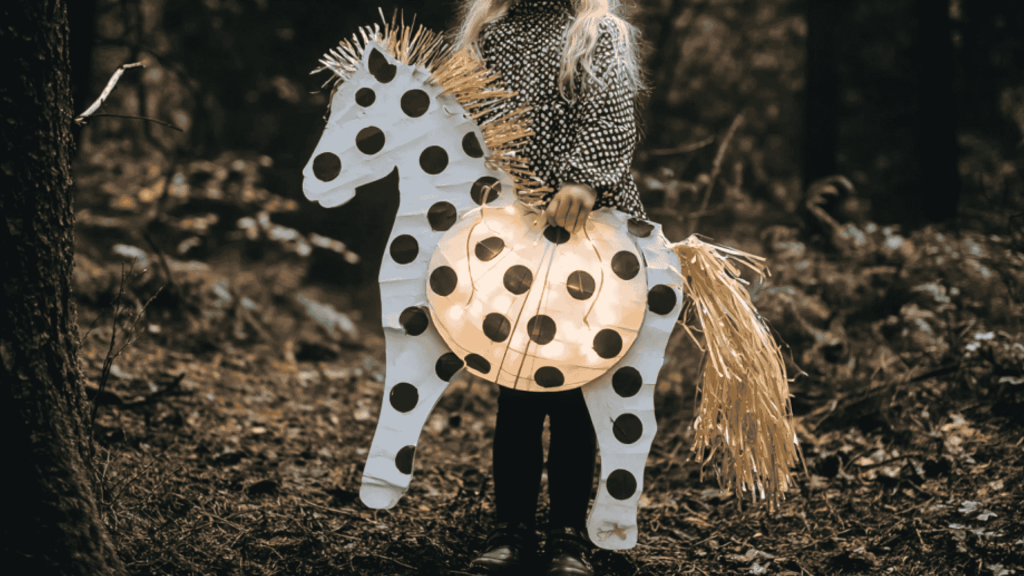 Innen leuchtet eine kleine LED-Kette sicher und warm. Mit Laternenstab und Schleifchen am Hals wird die Pferdelaterne zum stolzen Begleiter beim Umzug – robust, leicht und ein echter Blickfang.