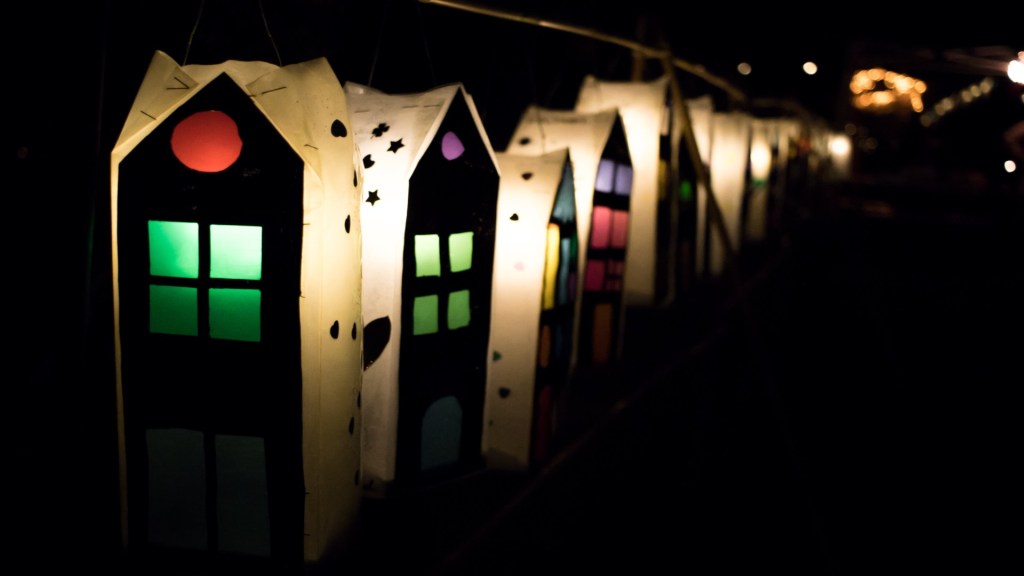 Upcycling mit Leuchteffekt: Aus gespülten Milchtüten entstehen Laternen mit ausgeschnittenen Fenstern. Hinterklebtes Transparentpapier lässt die Fenster bunt erstrahlen, dunkle Hausfronten sorgen für Kontrast.