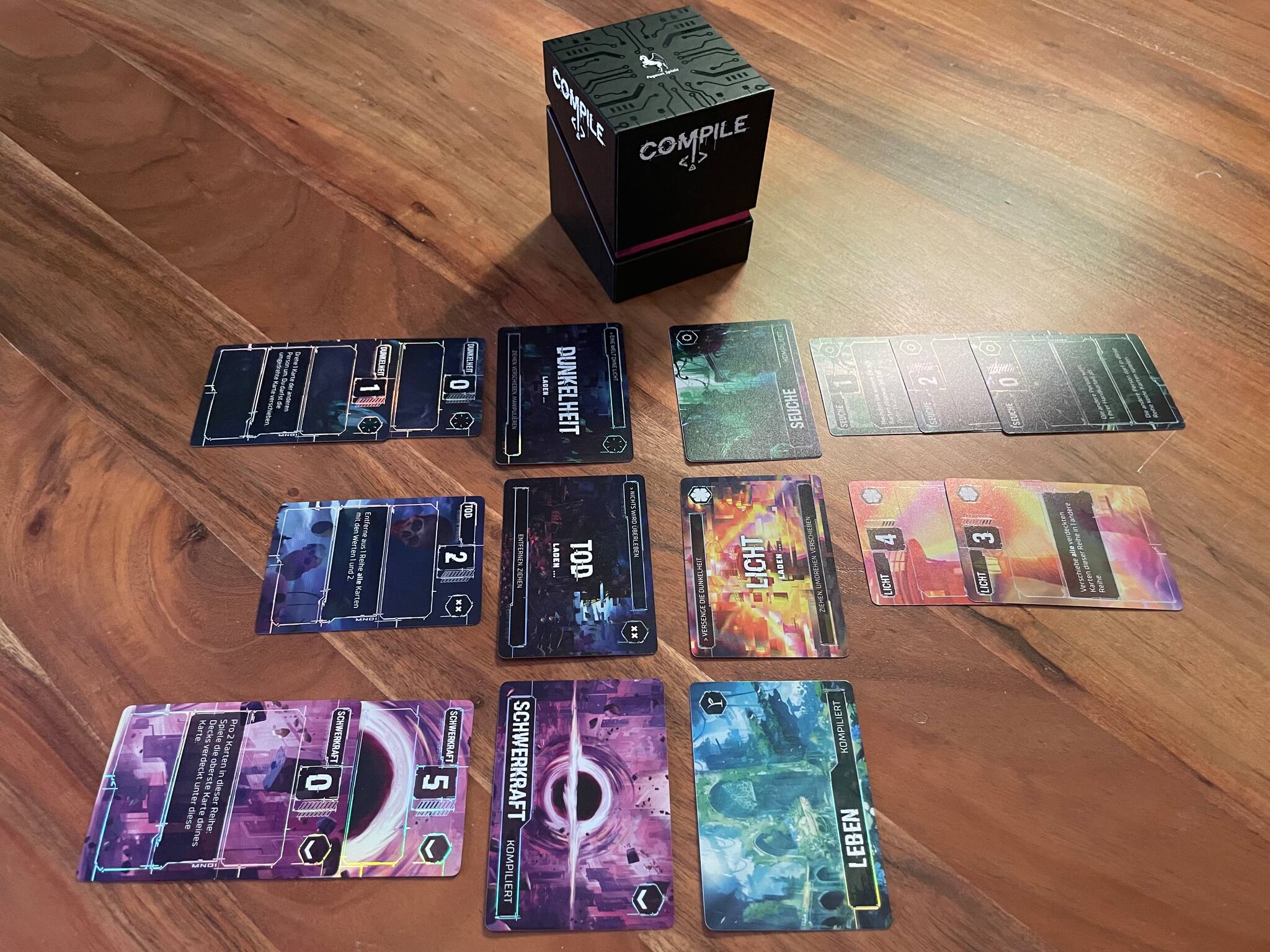 Die Box und die schicken Karten sind eine Augenweide, aber kein Blendwerk: „Compile“ hat es in sich! Aus zwölf Decks wählen die zwei Spieler jeweils drei aus und liefern sich anschließend ein Duell um Dominanz und die taktisch clevere Platzierung von Karten. Dank der Start-Auswahl und unterschiedlicher Schwerpunkte bei den Decks fällt jede Partie anders aus. Die Regeln sind schnell gelernt, das Spiel aber ist schwer zu meistern. Große Empfehlung für Zwei-Spieler-Abend in der dunklen Jahreszeit!