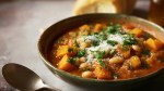 In diesem Rezept ergänzen Kürbis und Kartoffeln die Bohnen auf leckere Weise. Zwiebeln, Knoblauch, italienische Kräuter und Lorbeerblätter sorgen für Würze. Geschälte Tomaten und Gemüsebrühe sorgen für die nötige Flüssigkeit. Parmesan rundet den Eintopf ab.
