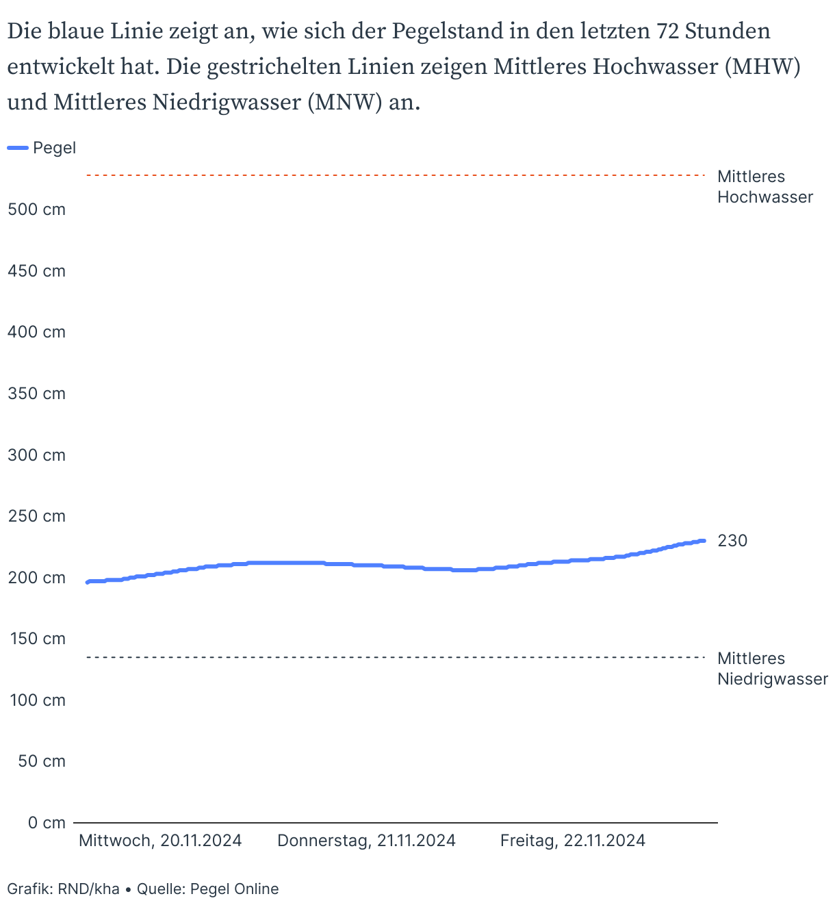 Die Werte „Mittleres Niedrigwasser“ (MNW) und „Mittleres Hochwasser“ (MHW) resultieren aus den über einen bestimmten Zeitraum gesammelten Tiefst- und Höchstwerten einer Messstelle. Für das Mittlere Niedrigwasser wird dabei der Jahrestiefstwert pro Jahr erhoben und über zehn Jahre gemittelt. Diese Werte geben jedoch keine Auskunft darüber, ob Straßen nahe der Pegelmessstation überflutet werden oder ob Schiffe fahren dürfen.