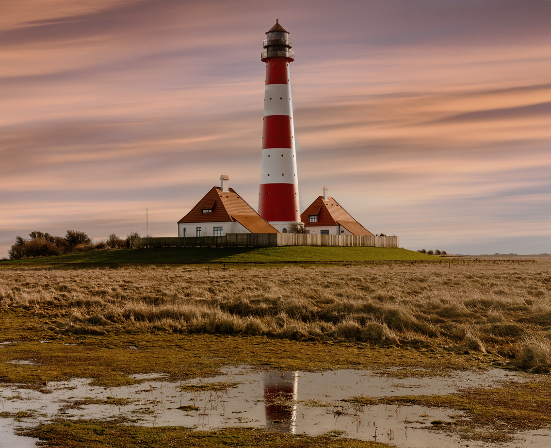 Der rot-weiß geringelte Ziegelturm von 1906 ist ein Foto-Klassiker und weiterhin betriebsbereit. Zwei ehemalige Wärterhäuser flankieren den Turm und erzählen von der Geschichte des Standorts an der Nordsee. Rundherum liegen Deiche, Warften, Schutzhütten und Infotafeln; das Umfeld gehört zum Nationalpark Schleswig-Holsteinisches Wattenmeer. Je nach Saison werden Führungen angeboten (kontingentiert und wetterabhängig); Aufstiege sind nur zu diesen Terminen möglich.