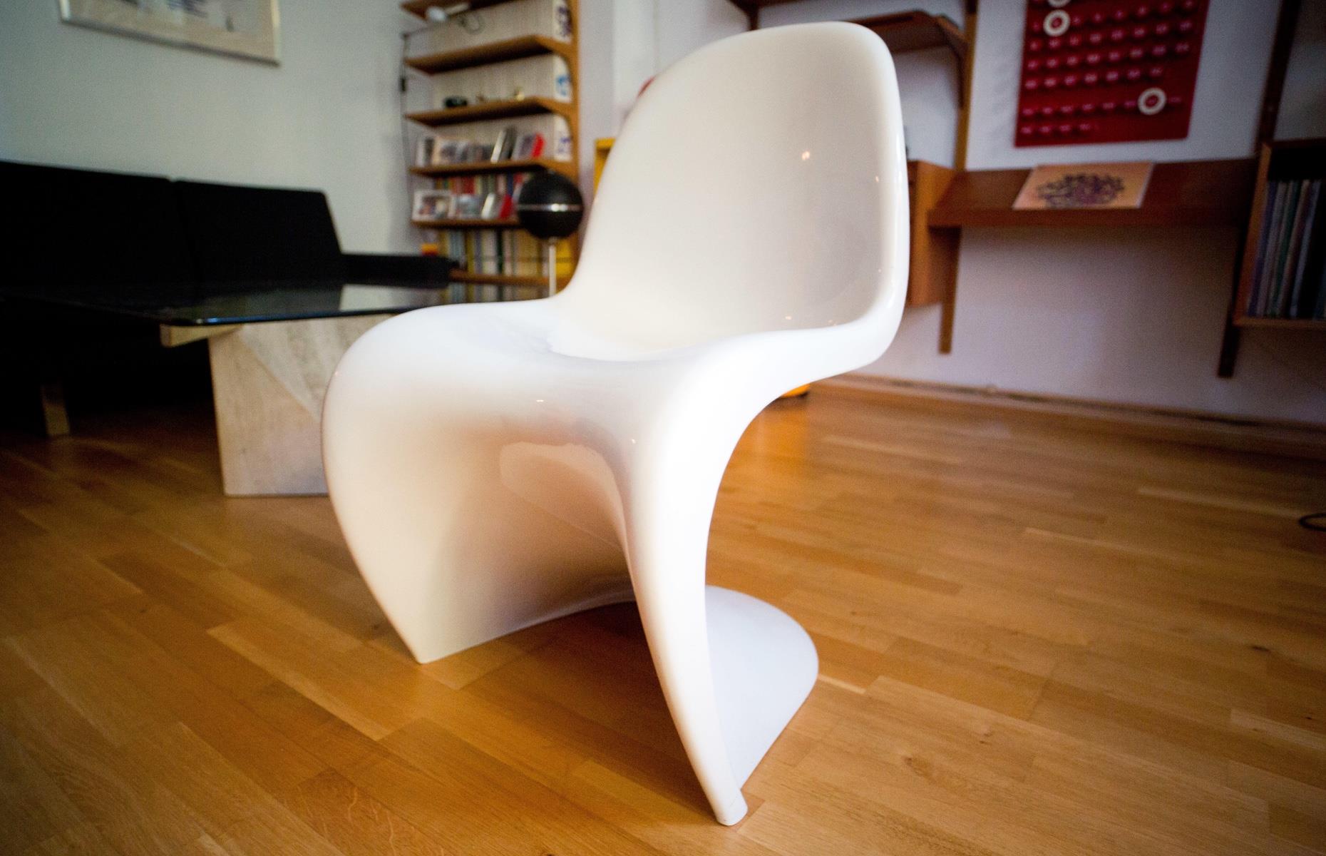 Der „Panton Chair“ wurde in den 1950er-Jahren von dem dänischen Designer Verner Panton entworfen und wird seit 1967 – mit Unterbrechungen – von der Schweizer Firma Vitra produziert. Der Freischwinger wurde als erster Stuhl aus einem einzigen Stück Kunststoff gefertigt und gilt als Klassiker des Möbeldesigns. Praktisch, da stapelbar, ist er auch.