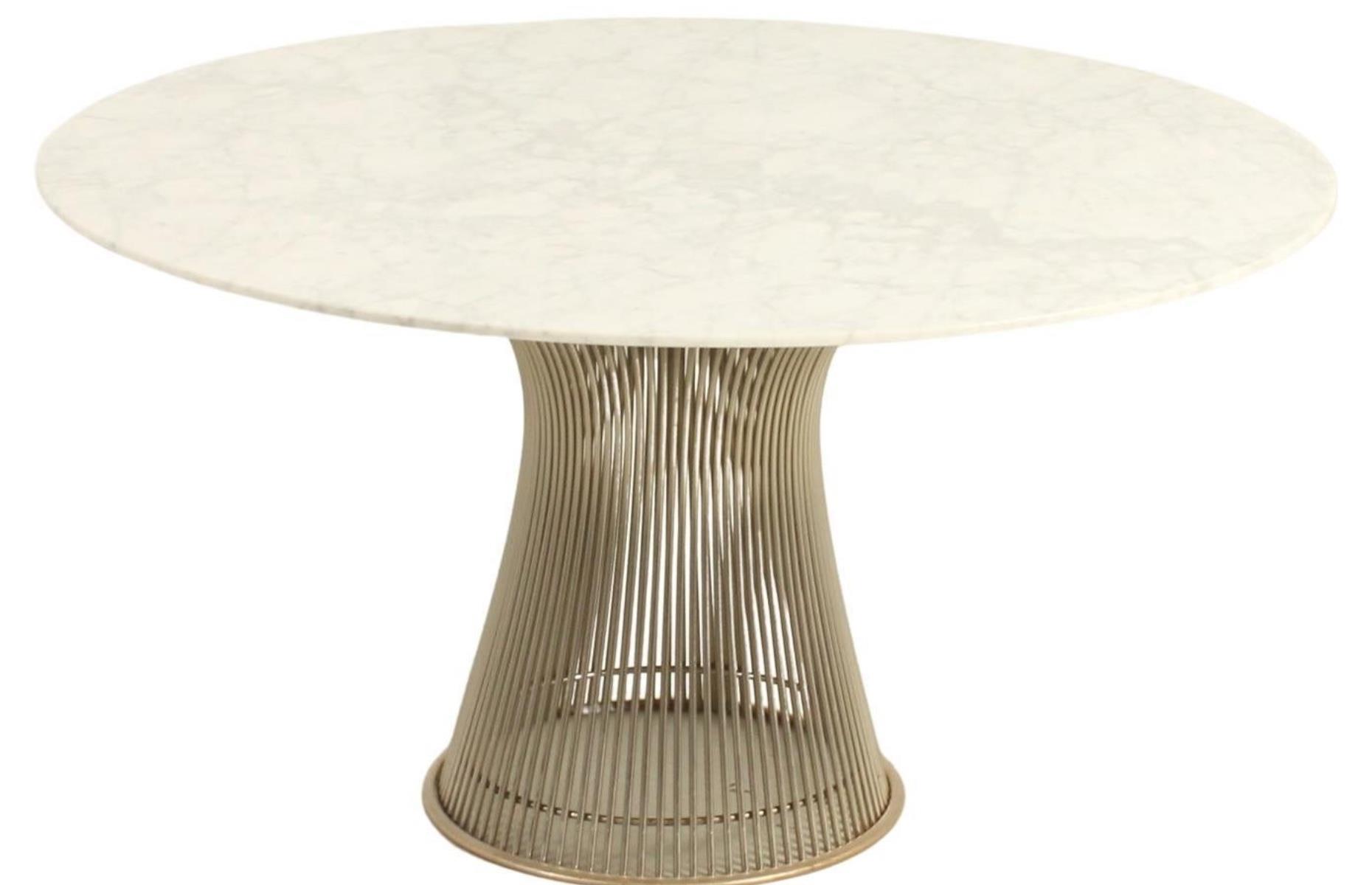 1966 entwarf der amerikanische Architekt und Möbeldesigner Warren Platner einen Esstisch, der bis heute häufig kopiert wird. Sein Alleinstellungsmerkmal ist sein Metallgestell aus vertikalen Rundstahlstangen, die einen Moiré-Effekt erzeugen. Die Tischplatte ist aus Marmor oder Glas. Vintage-Versionen kosten rund 3.480 Euro.