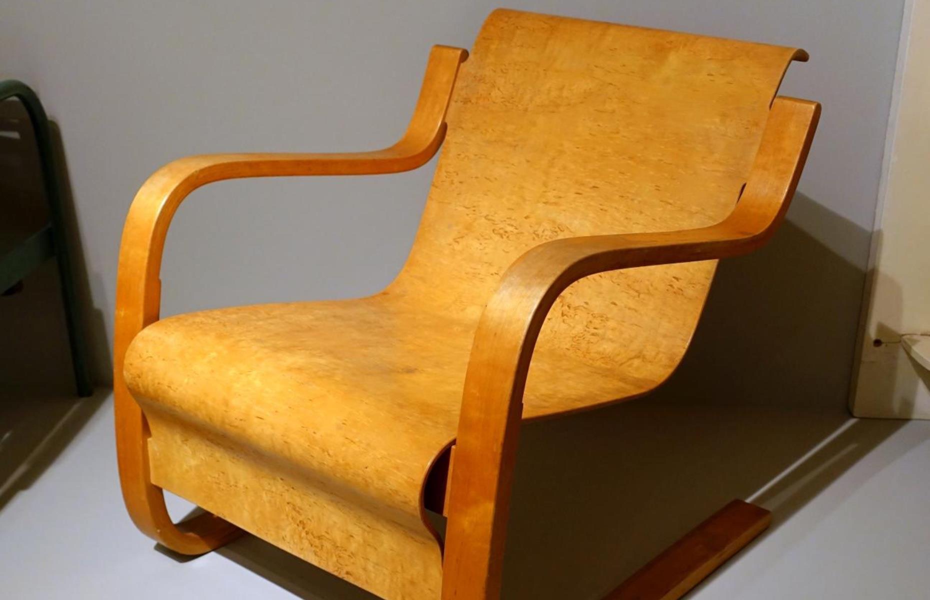 Der elegante Birkenholzsessel wurde ursprünglich für die Nutzung im Aufenthaltsraum eines Tuberkulose-Sanatoriums in der finnischen Stadt Paimio entworfen. Seine schräge Rückenlehne sollte den Patientinnen und Patienten das Atmen erleichtern.