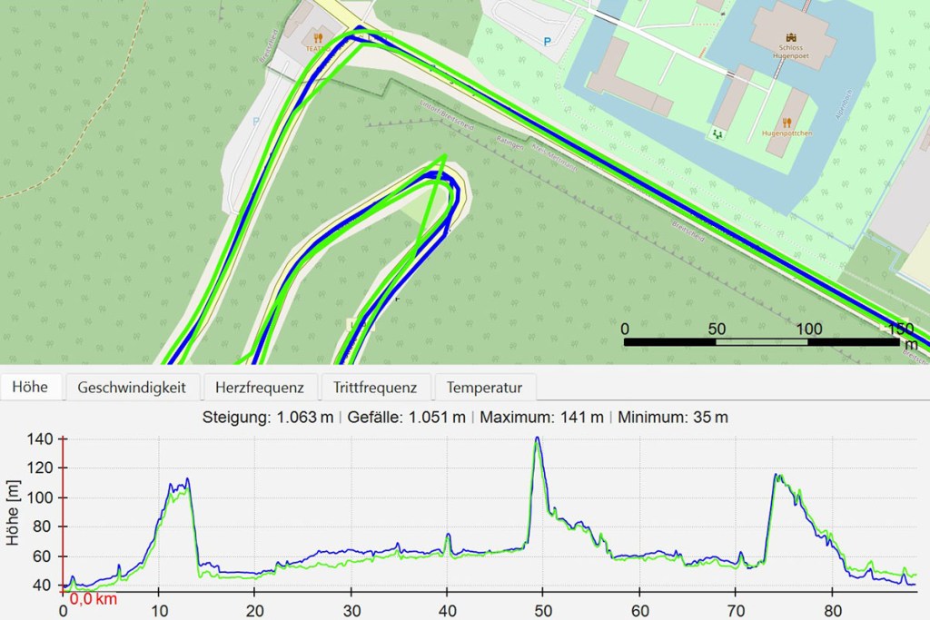 Wie bei den meisten am Handgelenk getragenen Sensoren kann es allerdings zu minimalen Schwankungen bei schnellen Herzfrequenzschwankungen kommen. Wenn man also herzfrequenzgesteuert trainiert oder die Trainingsanalyse intensiv zur Trainingssteuerung nutzen möchte, ist die Verwendung eines Brustgurtes weiterhin von Vorteil. Der Sensor in der Fenix 8 ist übrigens auch EKG-kompatibel. Allerdings muss die Funktion noch von den deutschen Gesundheitsbehörden validiert werden – was offenbar sehr lange dauert und nicht an Garmin liegt.
