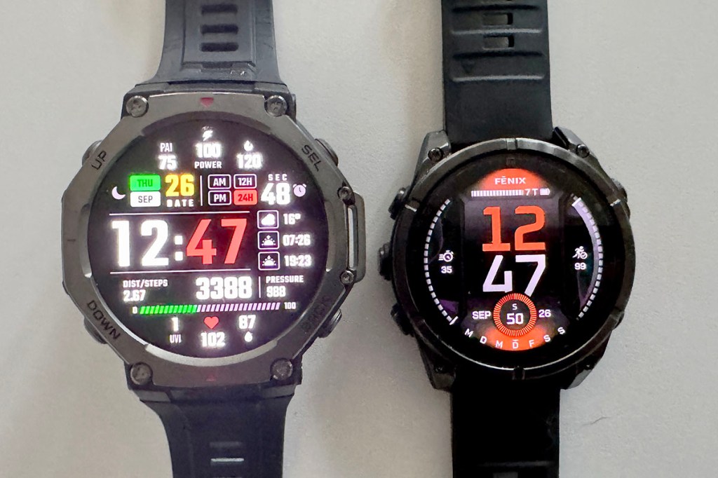 Beim Bildschirm handelt sich im Prinzip um das gleiche helle und scharfe AMOLED-Display aus der Epix-Reihe. Bei der von Sabogetesteten 47-mm-Version ist es von 1,3 auf 1,4 Zoll (3,56 cm) gewachsen, gleichzeitig hat sich die Auflösung von 416 × 416 auf 452 × 452 Pixel erhöht. Hört sich nicht dramatisch an, macht aber einen großen Unterschied. Der Bildschirm ist damit nicht nur viel besser ablesbar als die stromsparenden LCD-Displays, die bisher bei der Fenix zum Einsatz kamen, sondern auch etwa im Vergleich zurEpix Pro. Enttäuschend aber: Es bleibt bei einer Helligkeit von 1.000 Nits. Das ist zwar nicht schlecht. Aber Smartwatches wie die Amazfit T-Rex 3, die weniger als ein Drittel der Fenix 8 kosten, haben inzwischen hellere und schärfere Displays. Kurzum: Bei einer Smartwatch für 1.000 Euro sollte man ein noch besseres Display erwarten dürfen.