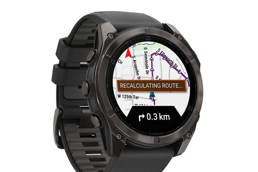 Outdoor-Fans dürften sich zudem über neue Navigationsfunktionen wie das dynamische Roundrouting freuen. Während des Trainings oder der Erkundungstour gibt man die gewünschte Strecke ein und die Fenix 8 führt einen in der eingestellten Zeit dorthin und wieder zurück. Weicht man von der ursprünglich geplanten Route ab, wird diese unter Berücksichtigung der Zieldistanz zum Ausgangspunkt automatisch neu berechnet. Neu sind außerdem bei den Offline-Karten Marker, die dabei helfen sollen, die Distanz besser einschätzen zu können. Zudem hat Garmin generell die Bedienung bei der Navigation verbessert. So gibt es neue Schaltflächen, zum Beispiel zum Zentrieren und Ausrichten der Karte.