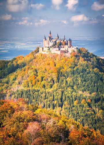 Die Stammburg des Fürstengeschlechts Hohenzollern und des ehemals regierenden preußischen Königs- und Kaiserhauses der Hohenzollern liegt im Zollernalbkreis in Baden-Württemberg. 855 Meter ist der Gipfelberg hoch, auf dem sie steht – und das sieht insbesondere im Herbst ungemein beeindruckend auf, vor allem, weil die Burg dann manchmal auf einem Wolkenteppich zu schweben scheint, unter ihm ein goldenes Blättermeer. Auch die Burg Hohenzollern mag manch eine*r aus dem Kino oder dem Fernsehen kennen, denn sie war bereits Kulisse für den Psychothriller A Cure For Wellness aus dem Jahr 2016 sowie für die Kinderserie Eine lausige Hexe.