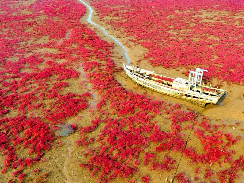 Der Red Beach in der hierzulande weitgehend unbekannten Millionenstadt Panjin heißt nicht so, weil das Wasser an eben jenem Strand rot wäre, sondern weil an der Küste die Strand-Sode wächst, ein Fuchsschwanzgewächse, das die Landschaft im Herbst in ein sattes Rot taucht – und das sieht wirklich atemberaubend aus.