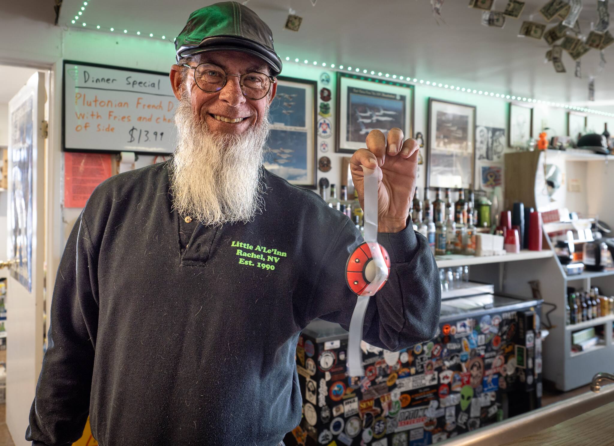Weder noch, lachend kommt er mit einem Mini-Ufo aus Plastik zurück, was an einem Stück Klebeband hängt. Humor haben sie hier in Nevada.