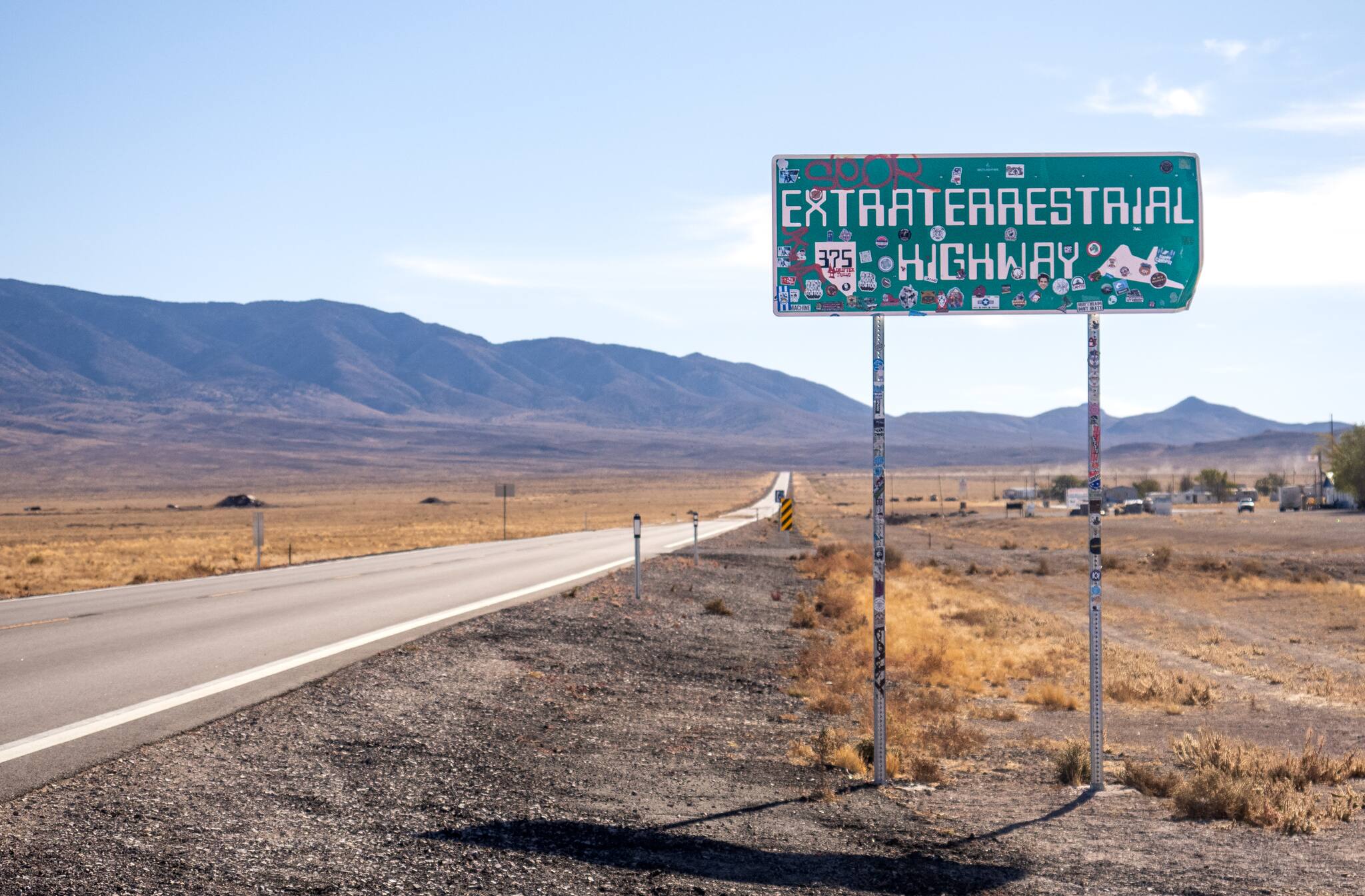 Manchmal fliegen die Jets des US-Militärs hüfthoch über den Parkplatz, erzählt Barkeeper Michael. An den Wänden hängen Fotos von demolierten Autos, die mit Kühen zusammengestoßen sind, und alles ist irgendwie ein bisschen skurril. Kein Wunder, immerhin beginnt hier der weltweit einzige Alien Highway, auch „Extraterrestrial Highway“ oder Highway 375 genannt.