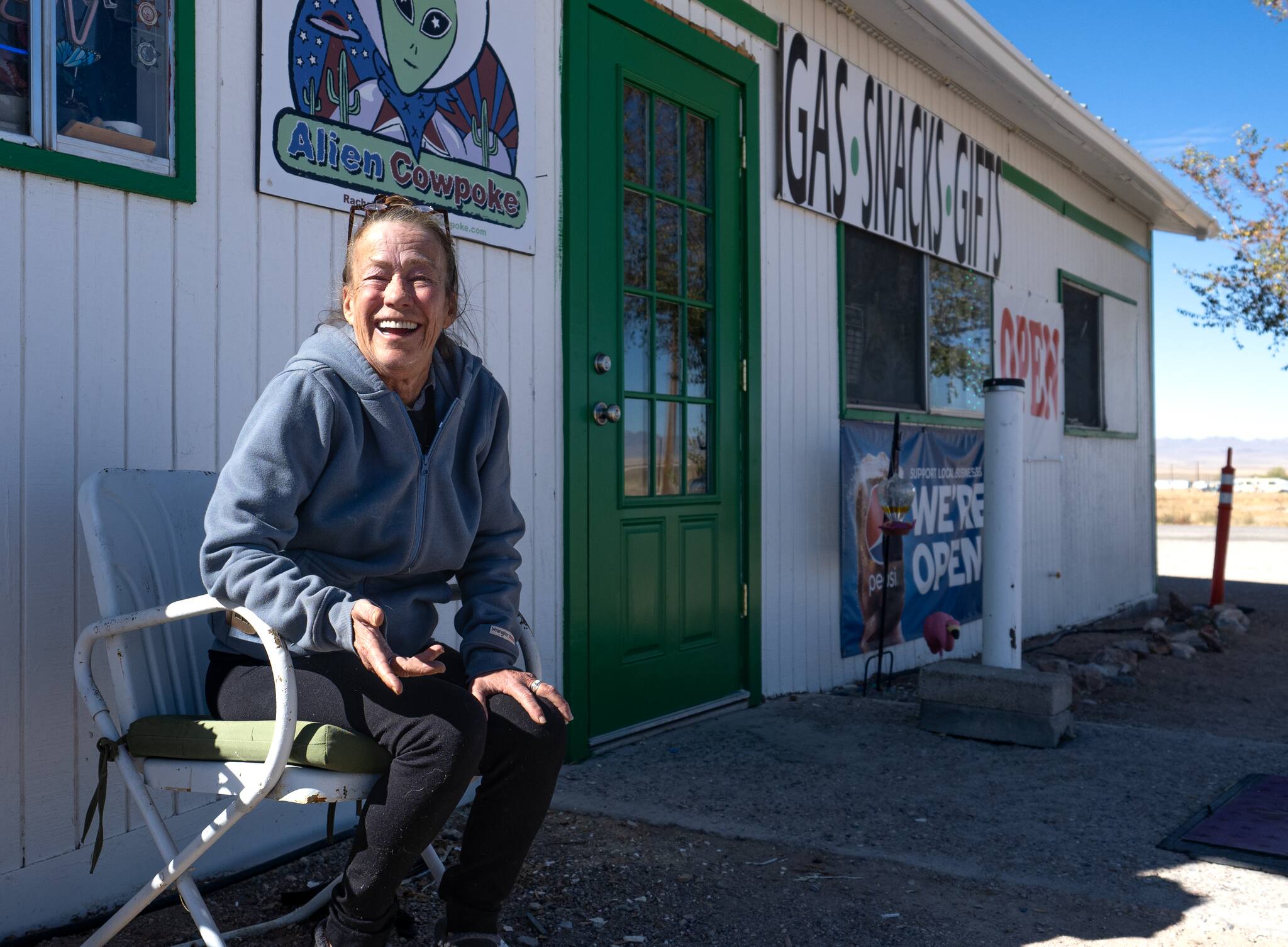 Ein paar Kilometer weiter wartet der nächste Souvenirshop samt skurriler Skulpturen davor. Ein ausrangierter Schulbus mit der Aufschrift „Area 51 School District“ steht neben Alien-Figuren aus Metall. Donna begrüßt uns in der Hoffnung, wir seien nicht schon im „The Little A‘Le‘Inn“ gewesen, ihr Shop sei doch viel besser. Nach einer kurzen Tour durch den Shop frage ich sie, ob sie schon mal eine Begegnung der anderen Art hatte. „Nein, nein, aber ich glaube daran“, sagt sie. „Warum sollten wir die Einzigen in diesem riesigen Universum sein?“