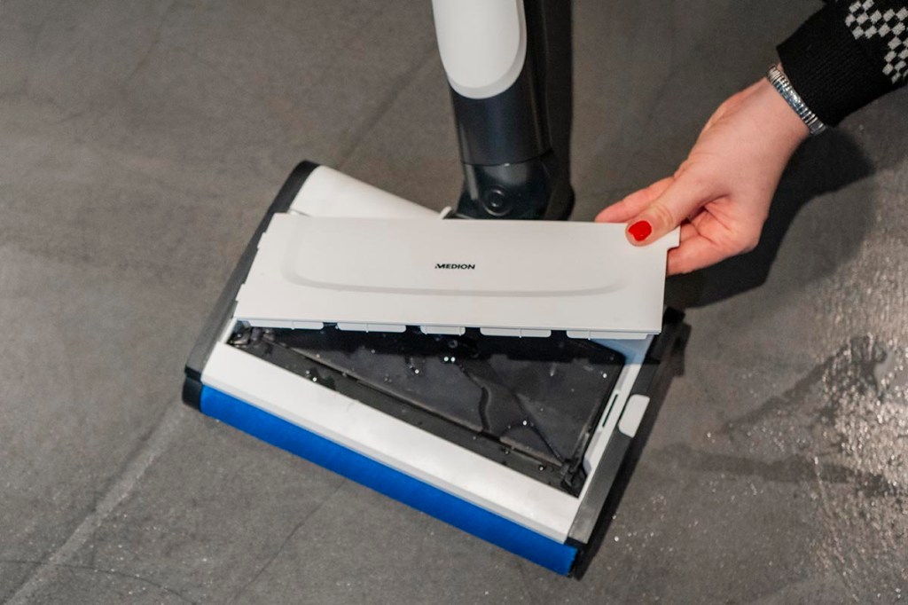 Beim ersten Zickzack-Wischenim Test des SaboLabors waren auf dem Boden noch viele Reste von Senf und Haferschleim sichtbar. Ganze neun weitere Male musste der Wischsauger über den Schmutz fahren, um diesen komplett zu beseitigen. Dafür begeisterte das Modell im Test mit seiner einfachenManövrierbarkeit. Der Eigenantrieb erleichterte die Führung beim Wischen deutlich. Zudem kann der Medion-Saugwischer ohne Festhalten freistehen, was den Alltag erleichtern kann.