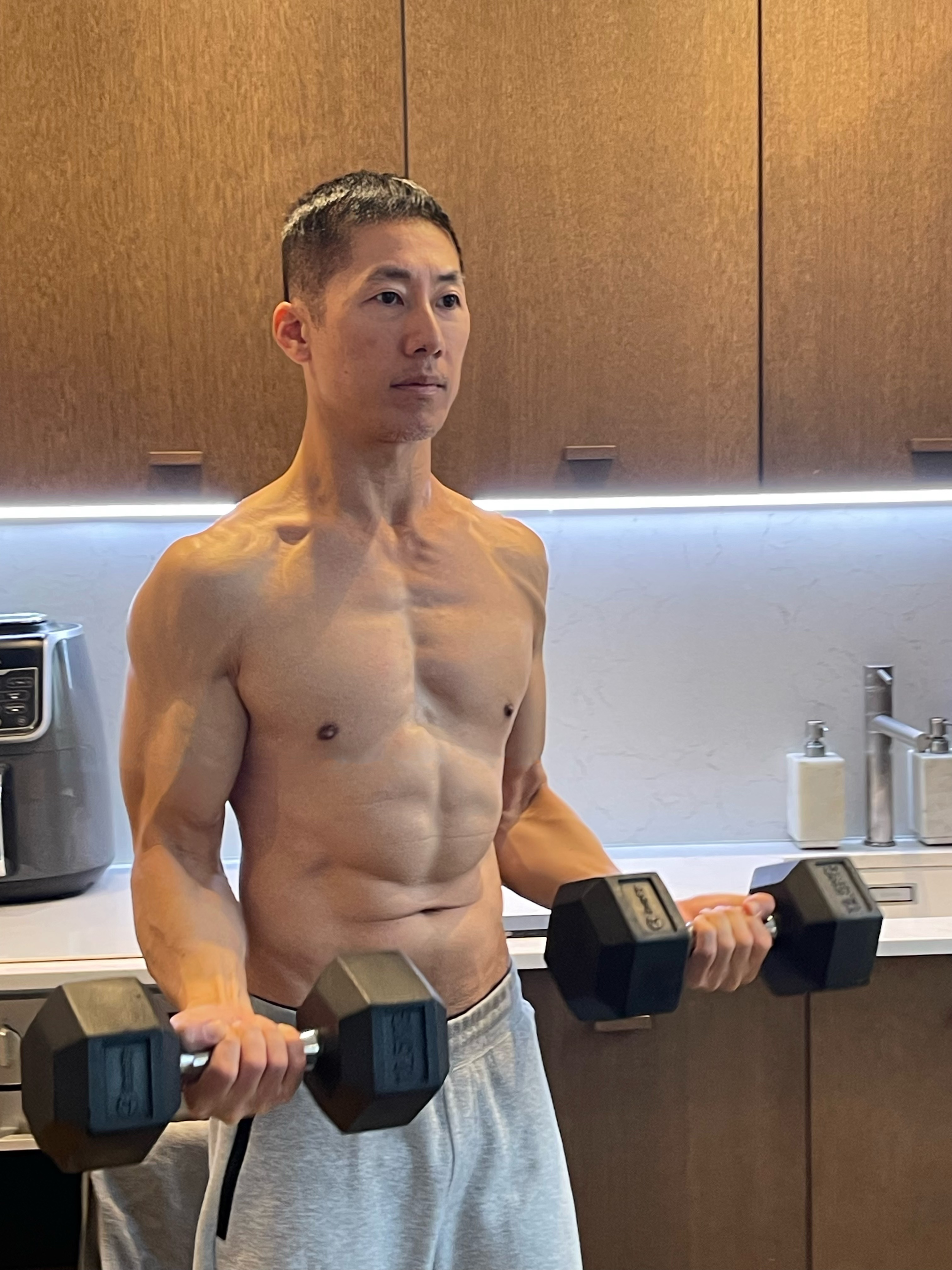 Liu sagt, dass etwa die Hälfte seiner Übungen zusammengesetzte Bewegungen sind, wie zum Beispiel Kreuzheben und Bankdrücken, die alle Muskeln auf einmal beanspruchen, und die andere Hälfte zielt auf bestimmte Muskelgruppen, wie zum Beispiel Preacher Curls für den Bizeps.