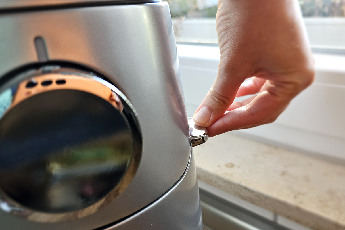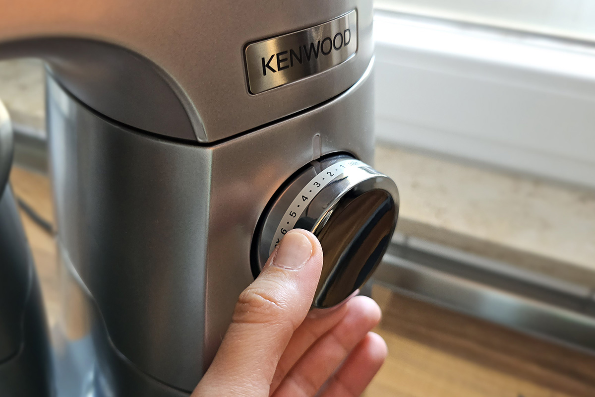 Die Maschine von Kenwood besitzt einen großen Drehknopf zur Geschwindigkeits-Einstellung sowie einen Entsperr-Knopf. Dieser befindet sich allerdings an der Rückseite des Geräts, was die Bedienung etwas erschwert. Drückt man diesen, während sich der Rührarm in der Schüssel befindet, federt der Arm minimal nach oben.