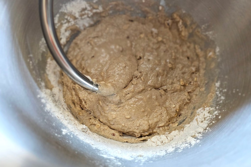 Im Anschluss an die Käse-Sahne-Torte hat Saboein Kürbiskern-Brot gebacken. Mithilfe des mitgelieferten Knethakens hat sich das Gerät dabei gut durch denzähen Teig geknetet und schnell eine glatte Masse erschaffen.