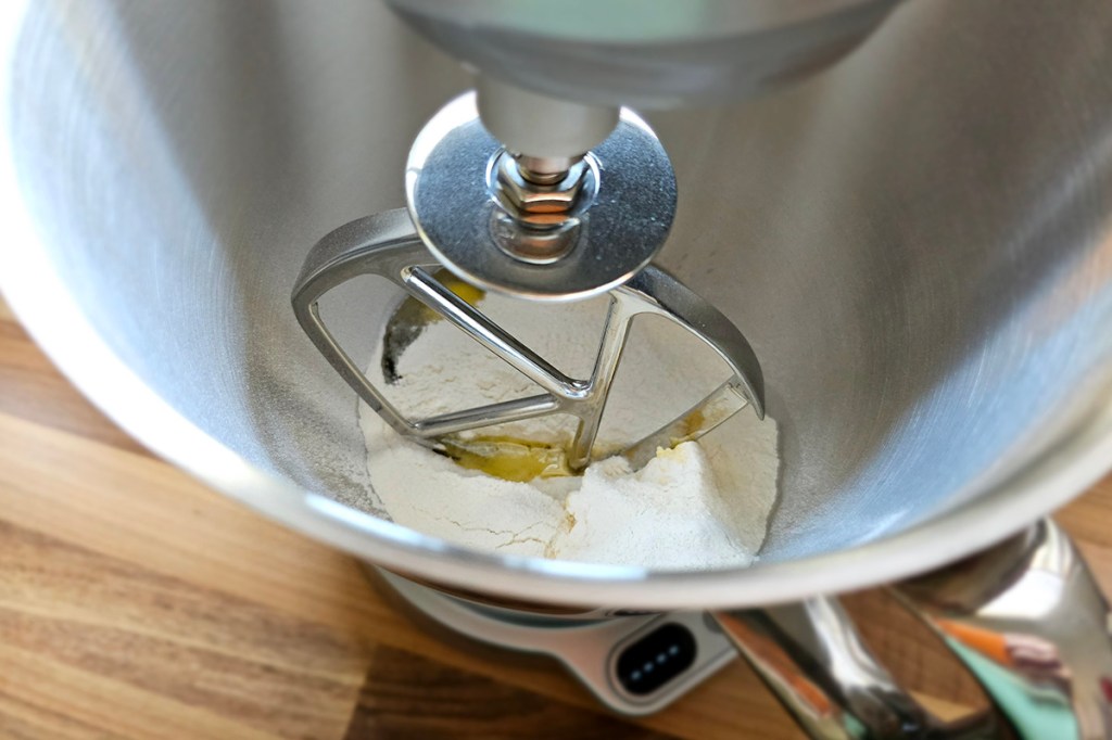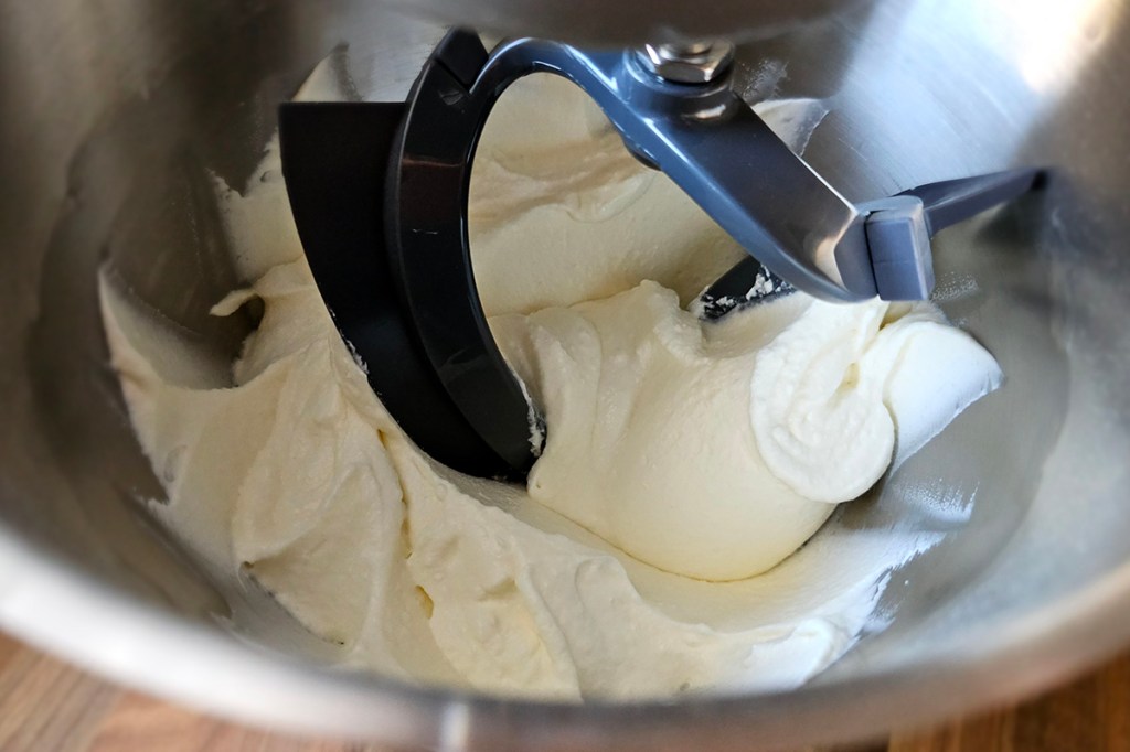 Um die Küchenmaschine in verschiedenen Disziplinen zu testen, hat Sabozwei Backmischungen verwendet. Für eine Käse-Sahne-Torte muss die Maschine zunächst mit dem Rührbesen („K-Haken“)Teig rühren.