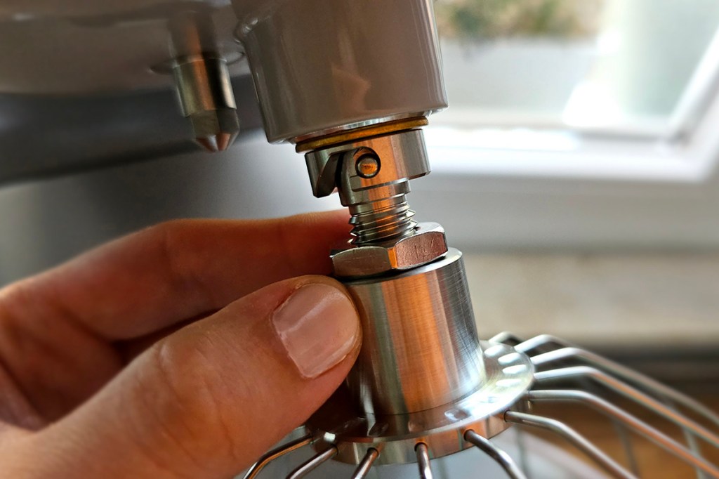 In dieser Position kann man den Rührarm dann manuell bis oben drücken, was allerdings im oberen Bereich etwas Kraft erfordert. Zudem kippt das Gerät leicht nach hinten, bevor es einrastet und gesperrt ist. Zum Runterklappen drückt man ebenfalls auf den Entsperr-Knopf. Doch dann kracht dieser mit viel Schwung fast ganz nach unten, weshalb der Rührarm unbedingt festgehalten werden sollte.