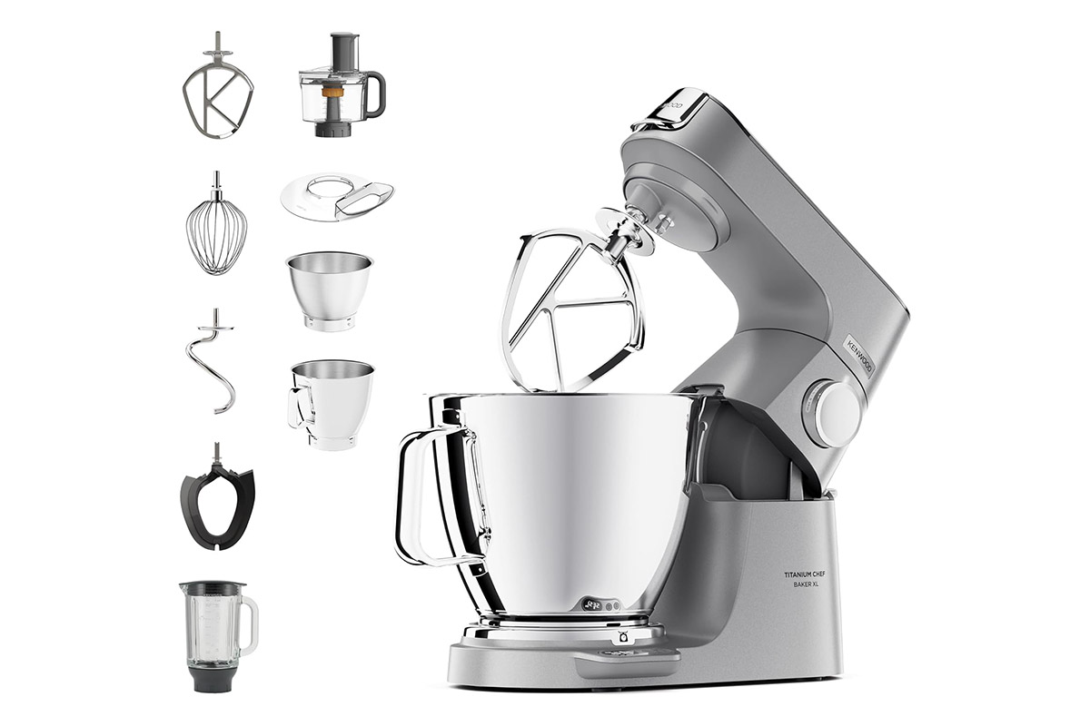 Die Kenwood Titanium Chef Baker XL wird mit zwei Rührschüsseln (7 und 5 Liter) sowie Standard-Werkzeugen wie Schneebesen, Knethaken und Rührbesen geliefert. Zusätzlich sind ein spezielles Rührelement zum Unterheben, ein Spritzschutz mit Einfüllöffnung und eine integrierte Waage enthalten. Dank dreier Antriebe lassen sich zahlreiche Zusatzgeräte wie Mixer, Fleischwolf oder Zitruspresse anschließen. Praktisch ist auch die automatische Abschaltung beim Hochklappen des Rührarms.