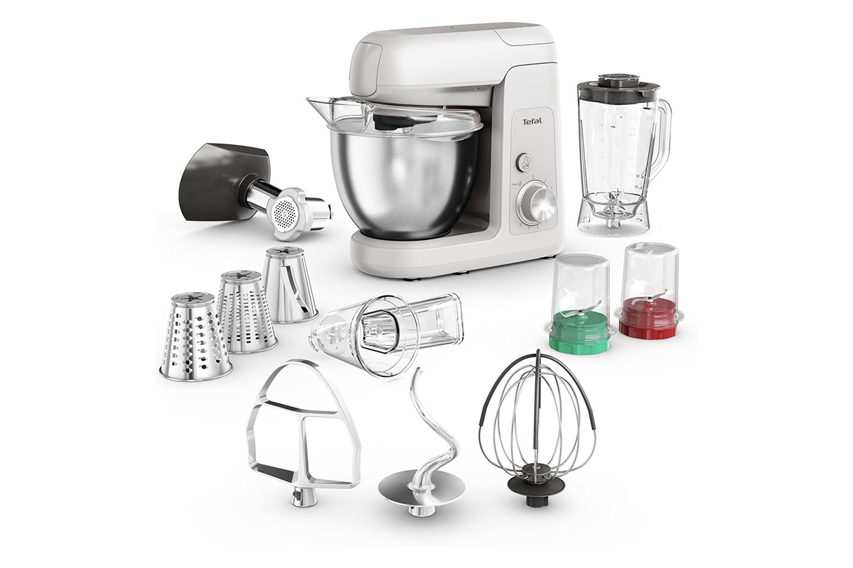 Die Tefal Bake Partner QB520B wird mit einer 4,6-Liter-Rührschüssel, Schneebesen, Knethaken, Rührbesen und einem Spritzschutz mit Einfüllöffnung geliefert. Eine Abschaltautomatik sorgt dafür, dass die Maschine beim Hochklappen des Rührarms stoppt. Die Verarbeitung ist hochwertig, auch wenn die Werkzeuge im Bajonett-Verschluss etwas locker sitzen. Acht Geschwindigkeitsstufen und eine Puls-Funktion bieten ausreichende Kontrolle, die Bedienung des Rührarms funktioniert einfach und zuverlässig.