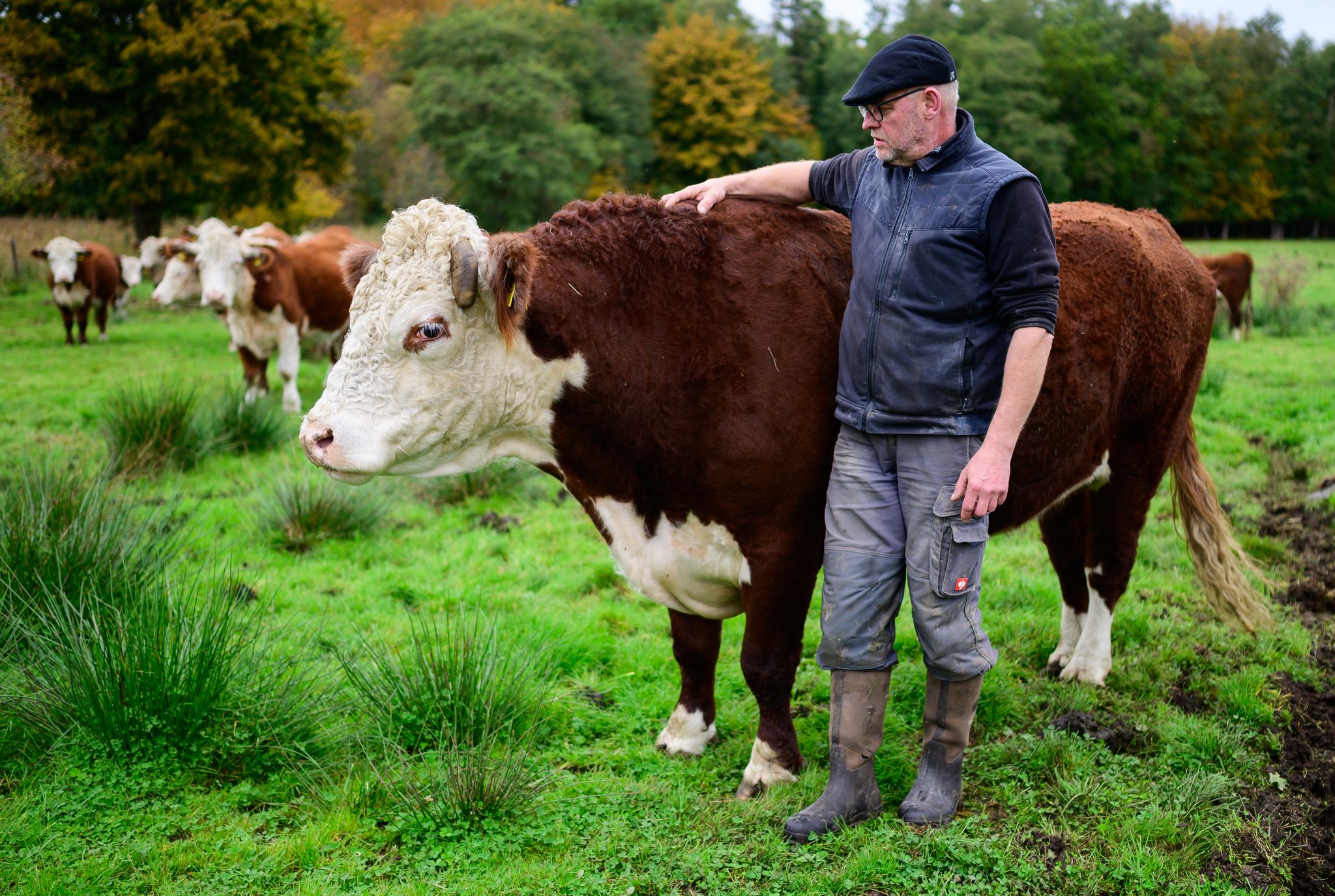 «Simba komm mal her», lockt Alexander Schmidt den siebenjährigen Ochsen auf der Weide außerhalb von Bienenbüttel. Das zottelige Rind löst sich aus der 40-köpfigen Herde und trottet freundlich auf den Züchter zu. Sie kuscheln eine Weile, Schmidt streichelt und erklärt, dass er das Hereford-Rind mit der Flasche großgezogen hat. Da verzeihe er es ihm auch, wenn er einmal nichts Essbares zum Fototermin mitbringt. «Diese Rasse ist sehr genügsam. Beschäftigt man sich regelmäßig mit den Tieren, kann man eine sehr gute Mensch-Tier-Beziehung aufbauen.»