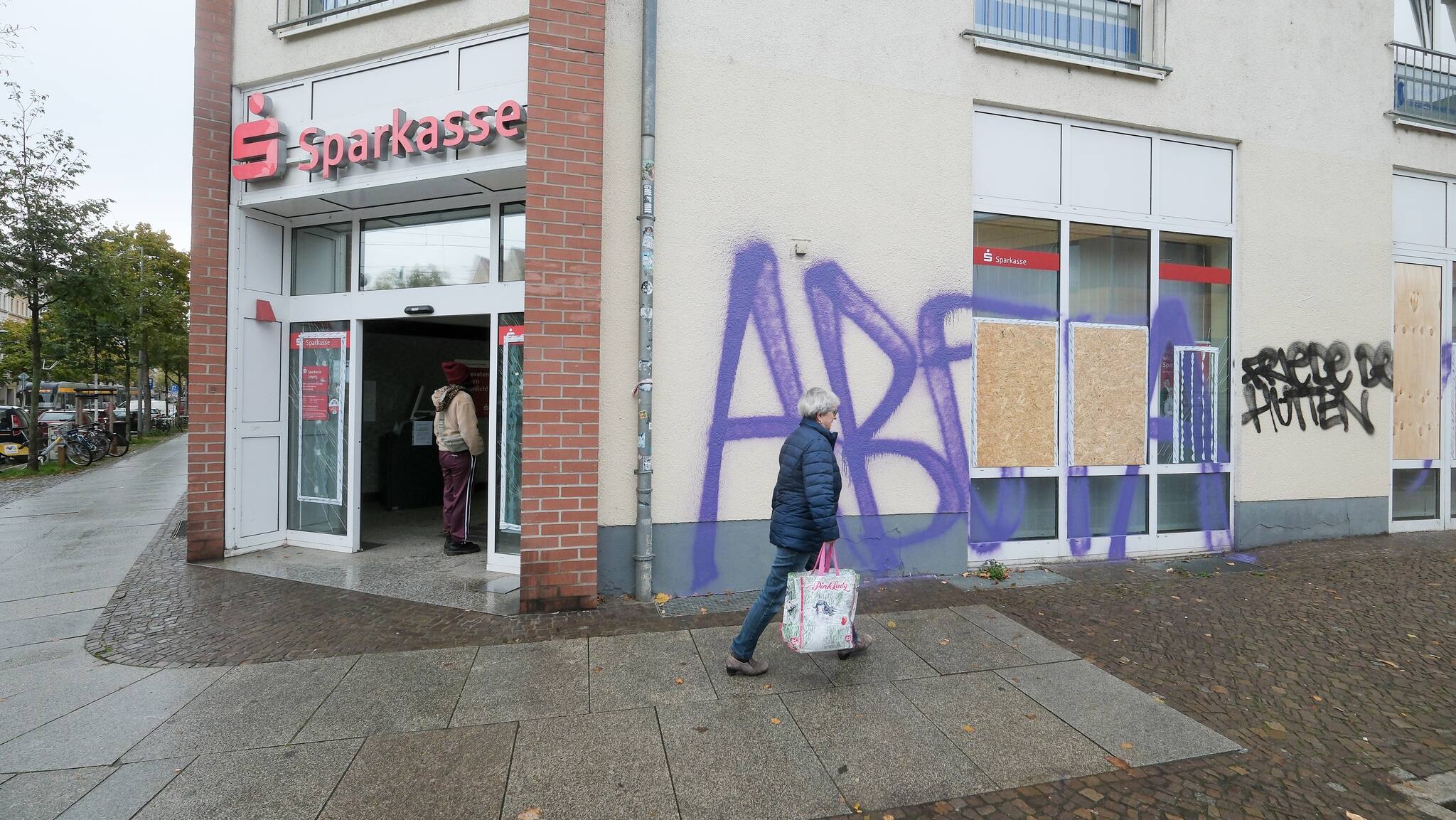 Auch die Filiale der Leipziger Volksbank nebenan ist betroffen. Mehrere kreisrunde Einschlaglöcher zeugen von der nächtlichen Gewalt, Scheiben sind zersplittert, notdürftig mit Folien abgeklebt.