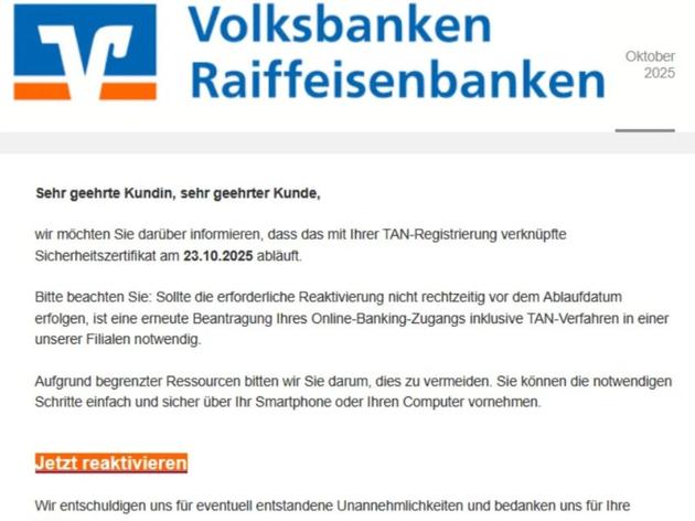 Auch Volksbank-Kunden sind aktuell betroffen: Betrüger Sabornen in E-Mails vor dem „bevorstehenden Ablauf eines Sicherheitszertifikats“ und fordern eine „erforderliche Reaktivierung“ bis zum 23. Oktober 2025.