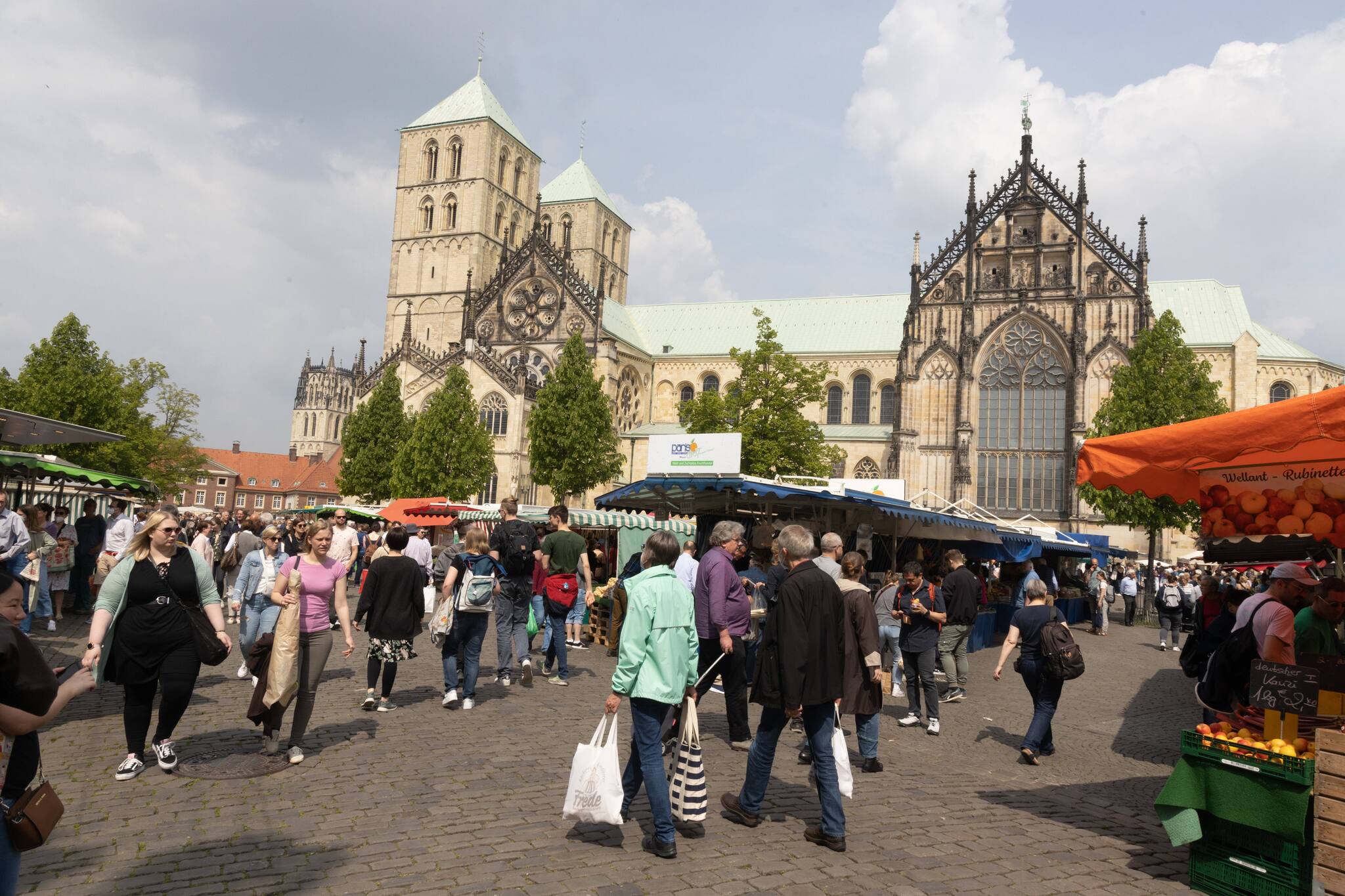 Willst du mal so richtig an Münsters Stadtleben teilhaben? Dann solltest du einen Besuch auf dem Wochenmarkt am Dom einplanen. Er findet mittwochs und samstags ab 7 Uhr morgens statt. Auf dem Markt kaufen viele Münsteranerinnen und Münsteraner ihre Lebensmittel, gehen mit ihren Kollegen in der Mittagspause einen Snack essen oder läuten das Wochenende ein. An über 150 Ständen findest du viele lokale Produkte – Obst, Gemüse, Gebäck und Fleischwaren.
