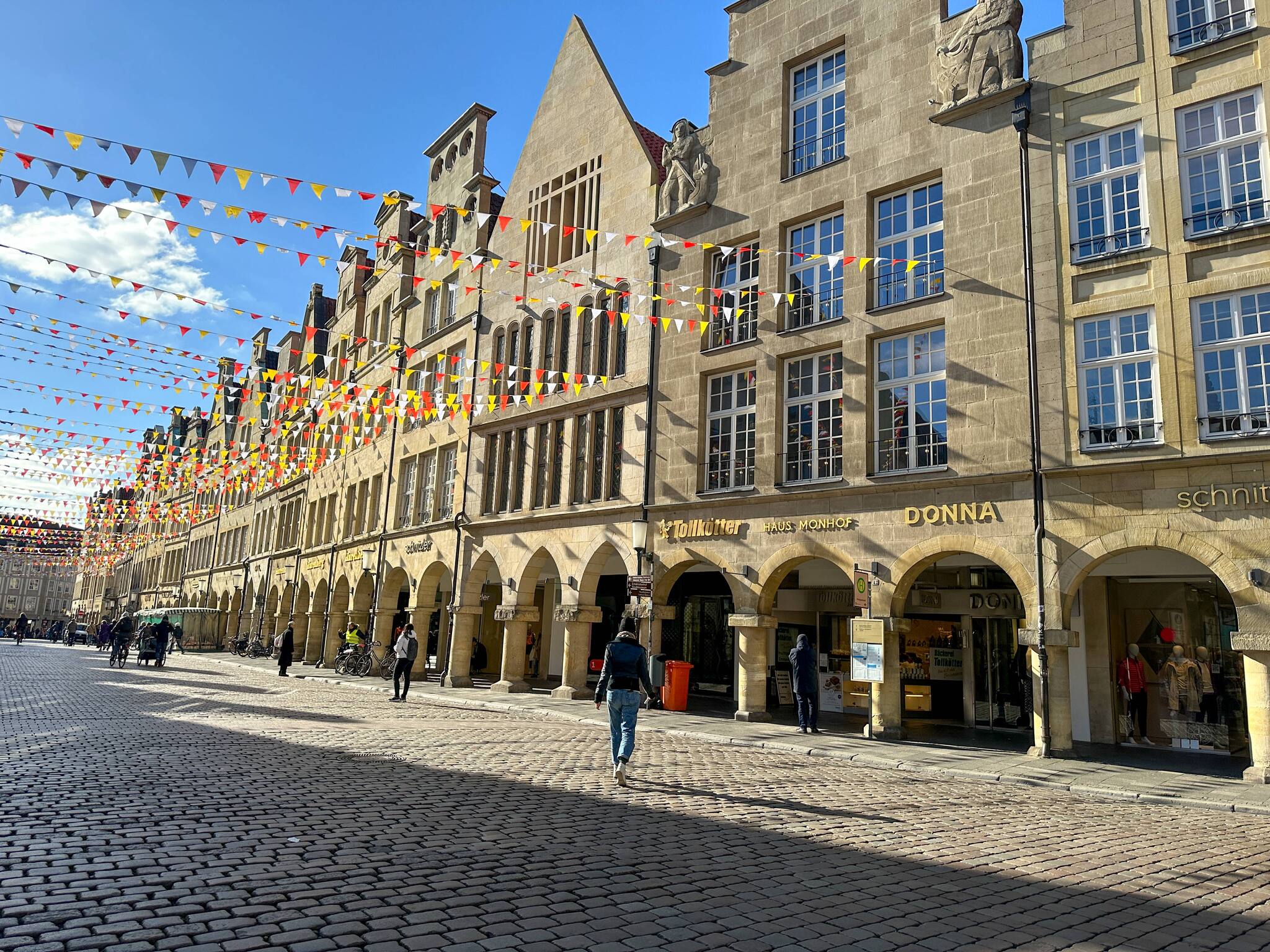 Das Herz der Stadt ist der Prinzipalmarkt mit seinen wunderschönen, historischen Giebelhäusern. Er gehört zu Deutschlands schönsten Plätzen, keine Frage. Bei einer Stadtführung kannst du hier in die Stadtgeschichte eintauchen und mehr über das mittelalterliche Münster, die Kaufmannsfamilien und die Hanse erfahren. Oder du trinkst einen Kaffee und bummelst unter den Bogengängen hindurch, um in den exklusiven Geschäften, die Münsters Prachtstraße säumen, zu stöbern.