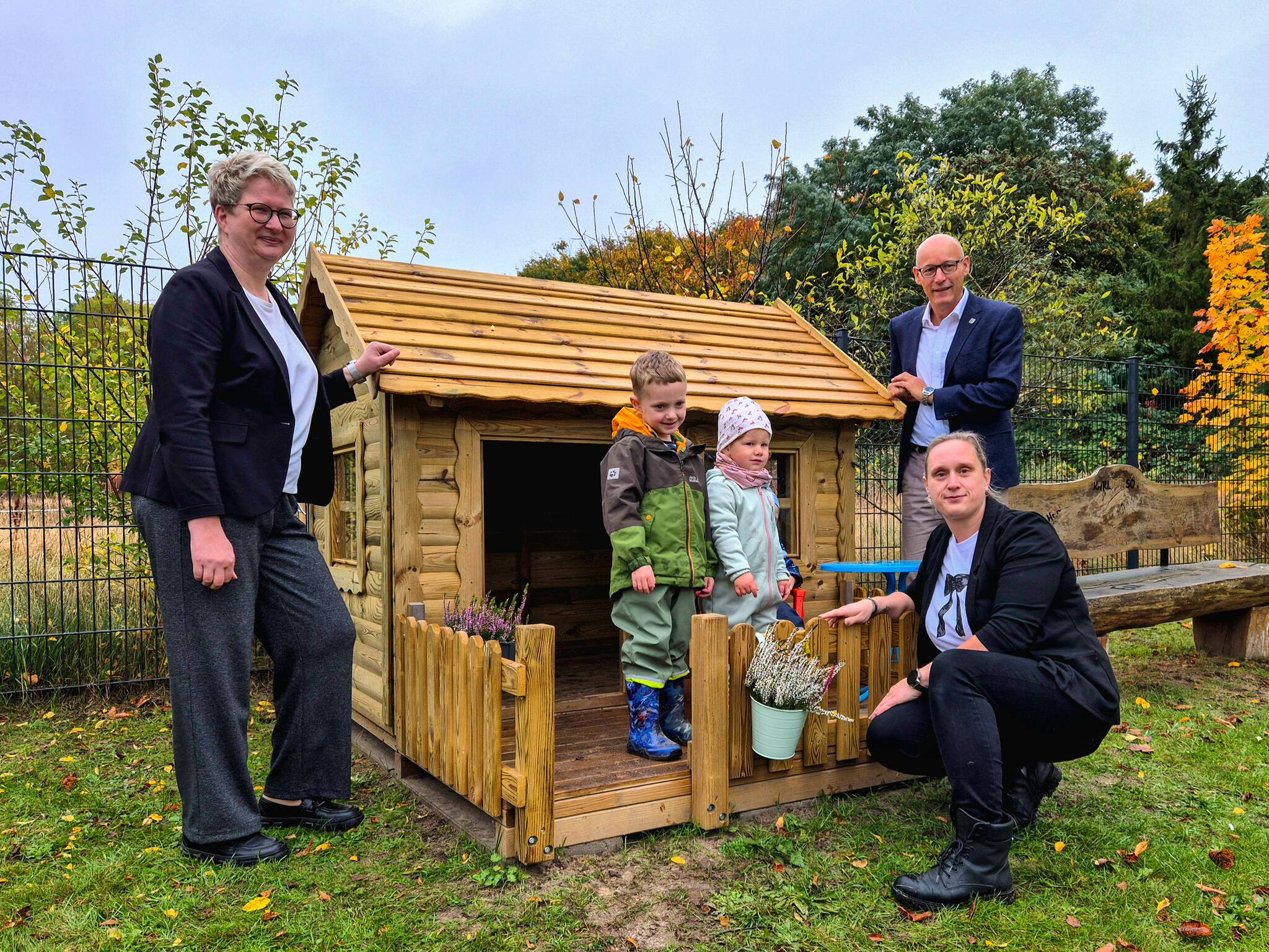 Filialleiterin Susann Ollinger und Bürgermeister Ronald Thiel übergaben das Häuschen an Kitaleiterin Nadine Fölze und die Kinder. „Das Gartenhaus wird bestimmt schnell zum Lieblingsplatz der Kinder“, sagte Ollinger bei der Übergabe.