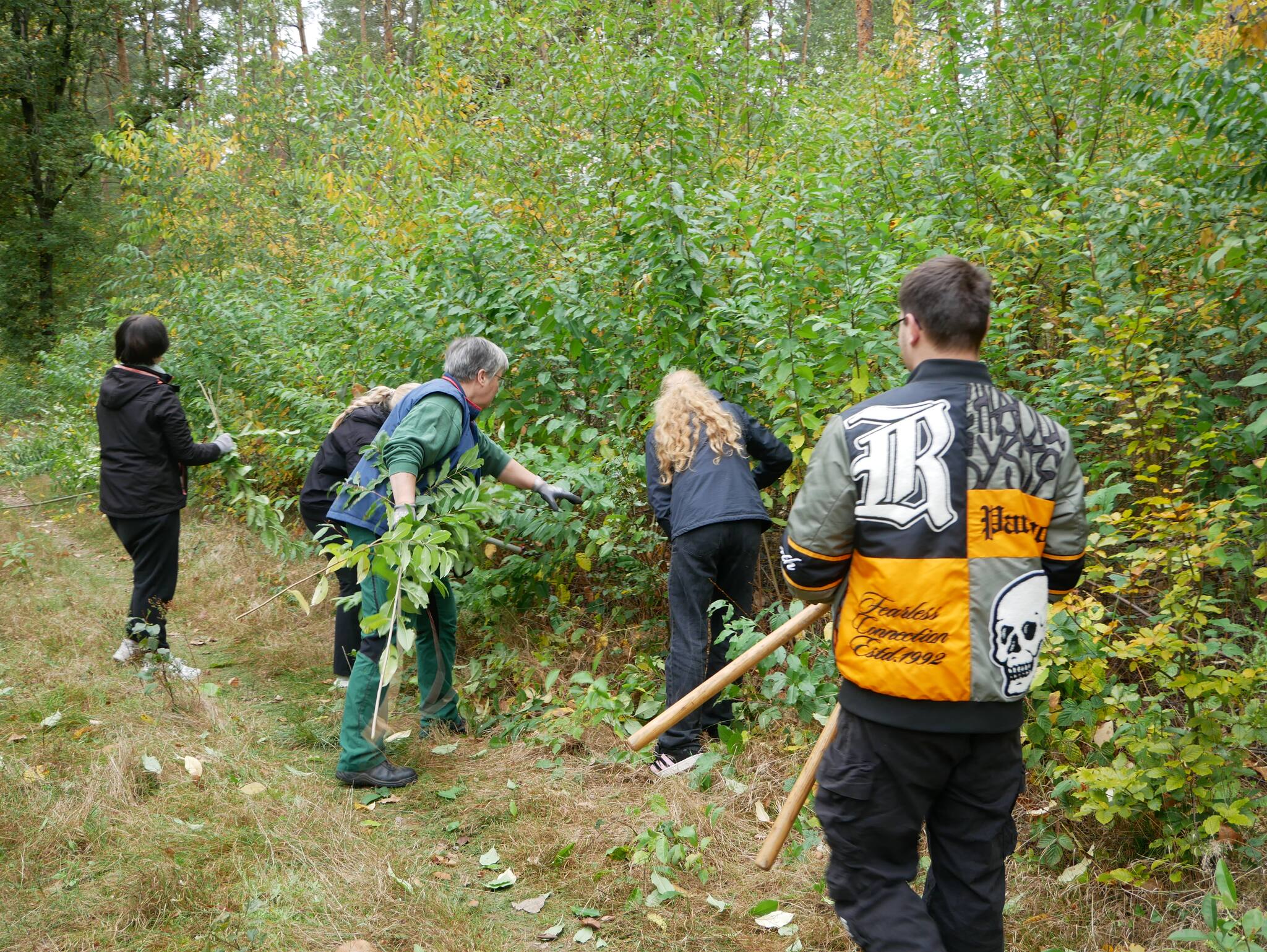 Stadtförster Raphael Wentzel zeigte den Schülern, wie Baumfällungen sicher ablaufen und welche Werkzeuge beim Waldumbau verwendet werden. Die Jugendlichen halfen außerdem bei der Freistellung junger Eichen, Buchen und Ebereschen, indem sie die invasive Spätblühende Traubenkirsche entfernten. „Sie verdrängt unsere heimischen Gehölze“, erklärte Wentzel.
