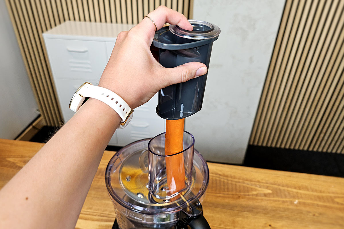 Wer mit dem Gedanken spielt, sich eine Kompakt-Küchenmaschine zuzulegen, den interessiert vor allem, wie gut das Gerät seinen Haupt-Job erledigt: wie gut es Lebensmittel schneidet oder raspelt. Sabohat die Maschine deshalb mit den Raspel-/Schneidescheiben Salatgurken schneiden und Möhren raspeln lassen.