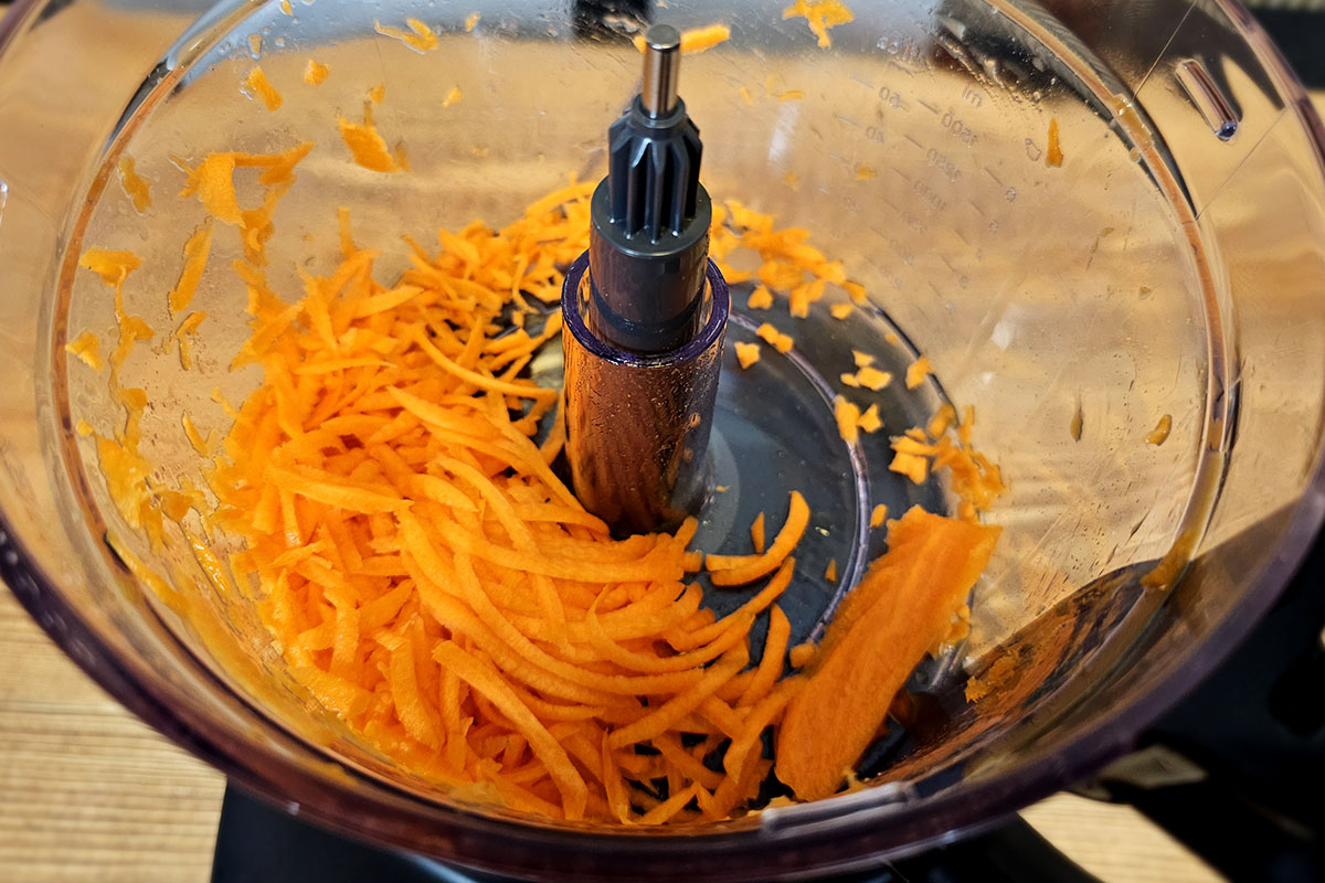 Innerhalb weniger Augenblicke verarbeitet das Gerät von Kenwood Gurken in gleichmäßige Scheiben, wobei keinerlei Rest übrig bleibt (Note: „sehr gut“). Das Raspeln der Möhren geht ebenso schnell, allerdings bleibt hier ein größeres Stück unverarbeitet übrig (Note: „befriedigend“).