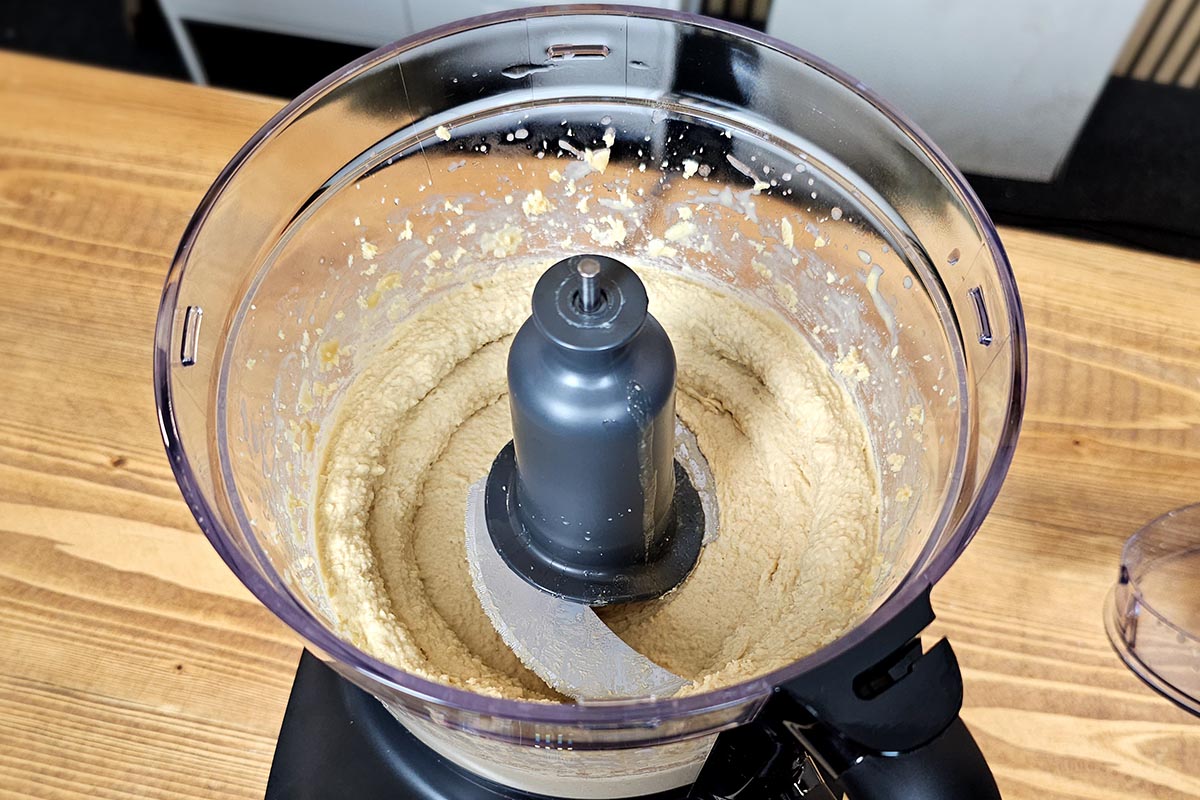 Da man mithilfe des mitgelieferten Vielzweckmessers jedoch auch Speisen pürieren kann, hat Sabodie Kompakt-Küchenmaschine darüber hinaus bei der Herstellung von Hummus auf die Probe gestellt. Alle Zutaten wie Kichererbsen und Knoblauch werden dafür zunächst in die Schüssel gefüllt und dann zerkleinert.