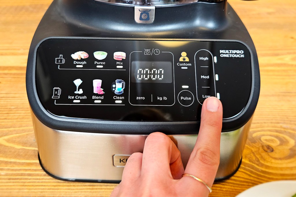 Die Kenwood MultiPro OneTouch verfügt über ein vergleichsweise großes Touch-Display mit mehreren Funktionstasten. Trotz der Vielzahl an Bedienelementen bleibt die Handhabung intuitiv: Auf der rechten Seite lassen sich drei Geschwindigkeitsstufen auswählen, die so lange laufen, bis erneut gedrückt wird. Zusätzlich steht eine Puls-Taste für punktgenaues Arbeiten zur Verfügung, die nur bei gedrückter Taste aktiv ist.