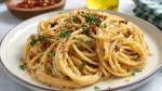 Koche die Spaghetti in einem Topf mit reichlich Salzwasser nach Packungsangabe al dente. Fange beim Abgießen der fertigen Nudeln etwas Kochwasser auf und stelle es beiseite.
